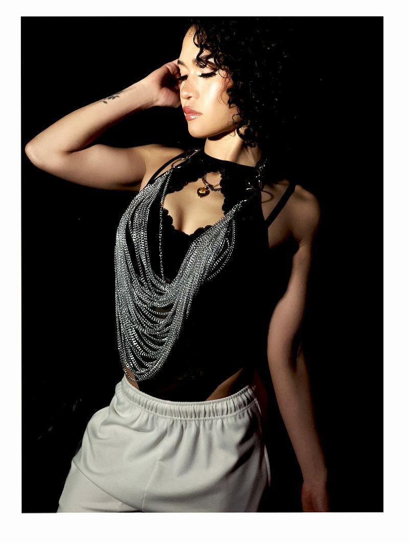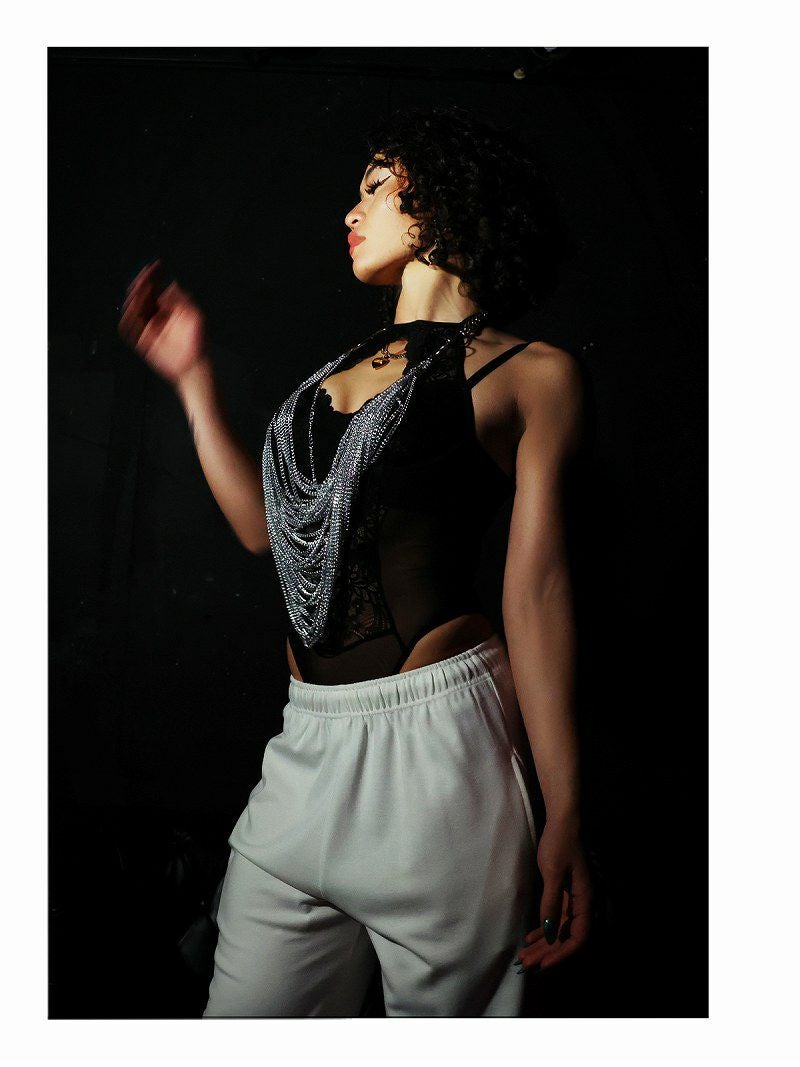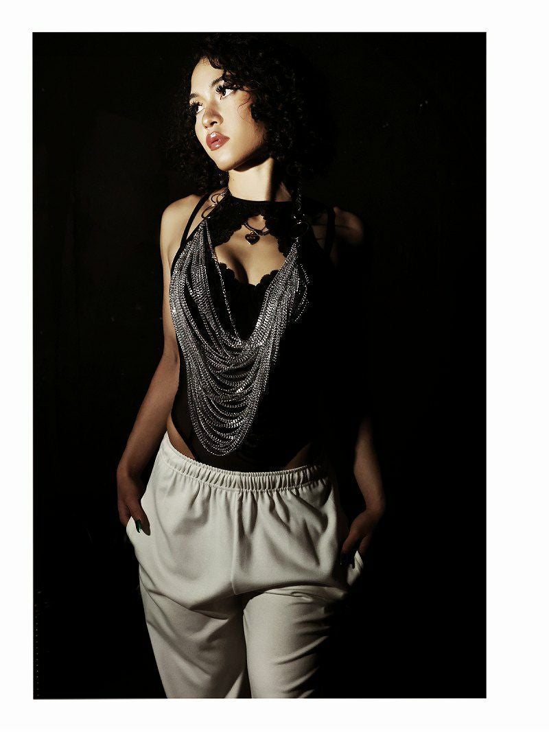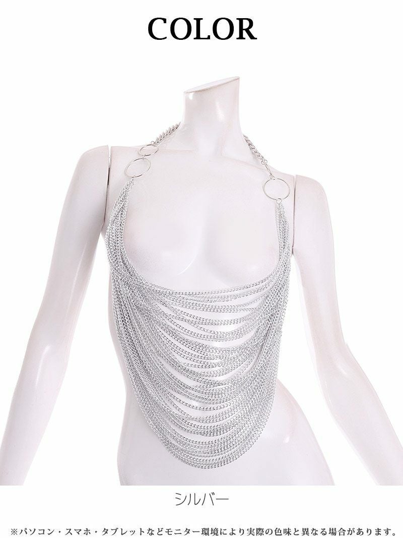 華やかなネックレス風ボディーチェーンで、目を引くステージ衣装に。