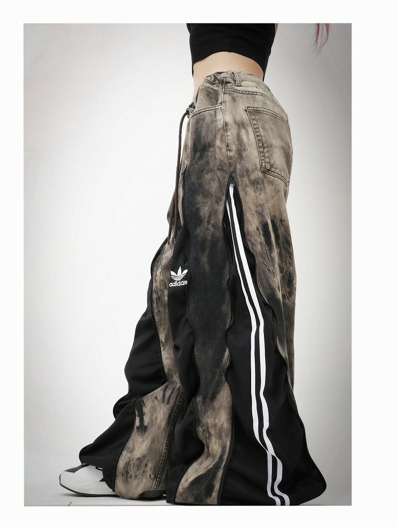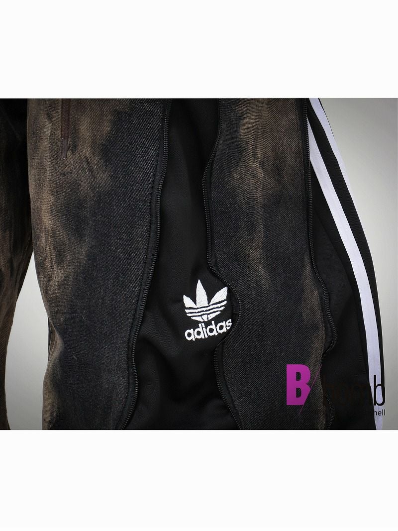 ブリーチ加工のような独特のウォッシュ感が魅力のブラックデニムと、アディダスジャージを組み合わせた、存在感抜群の再構築ワイドパンツ。