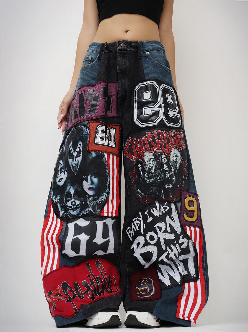 様々なデニム生地と、KISSなどのロックバンドモチーフのパッチ、ナンバリング、メッセージプリントを贅沢にパッチワークした、究極の再構築ワイドパンツ。