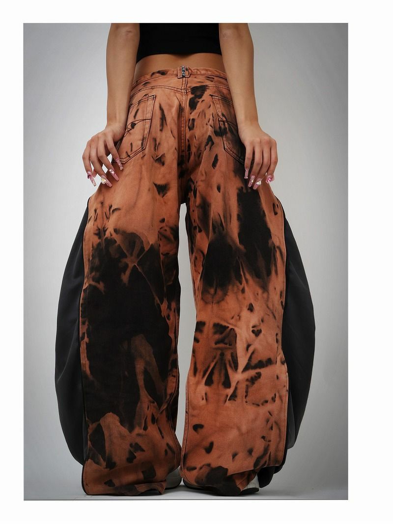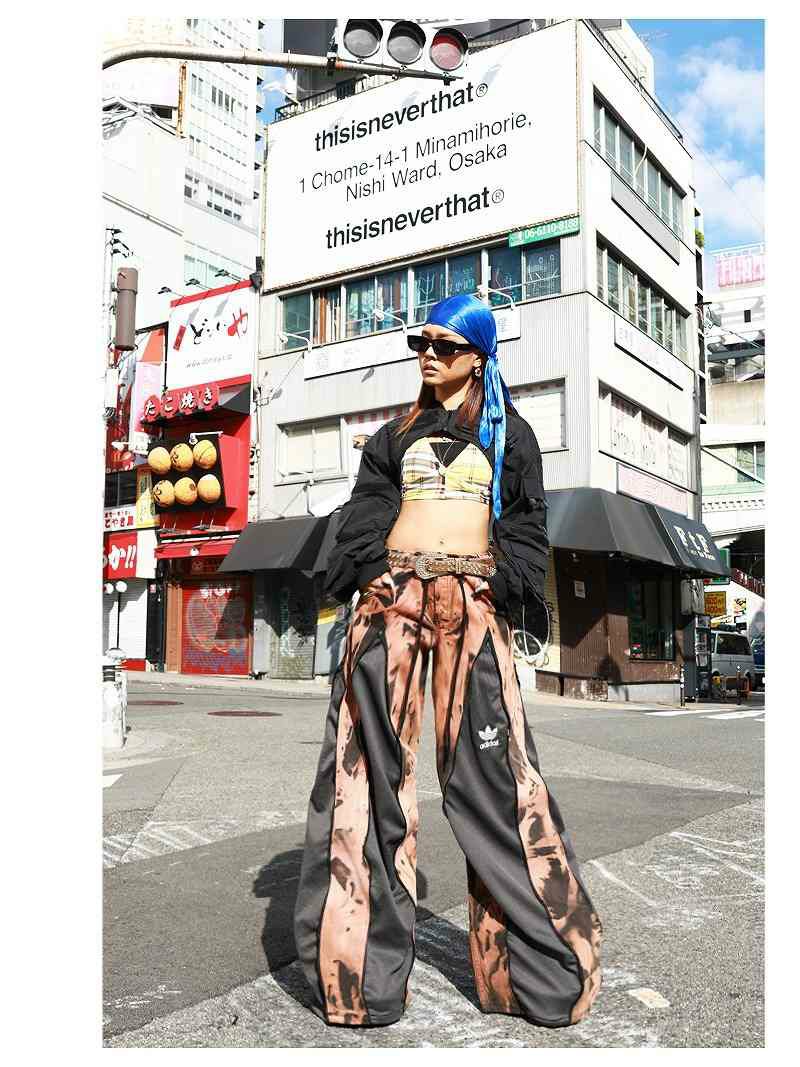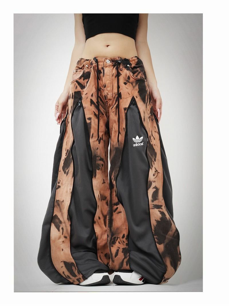 ブリーチによって生み出された独特な茶系のタイダイ柄デニムと、アディダスのジャージ素材を組み合わせた、他に類を見ないカラーリングの再構築ワイドパンツ。