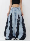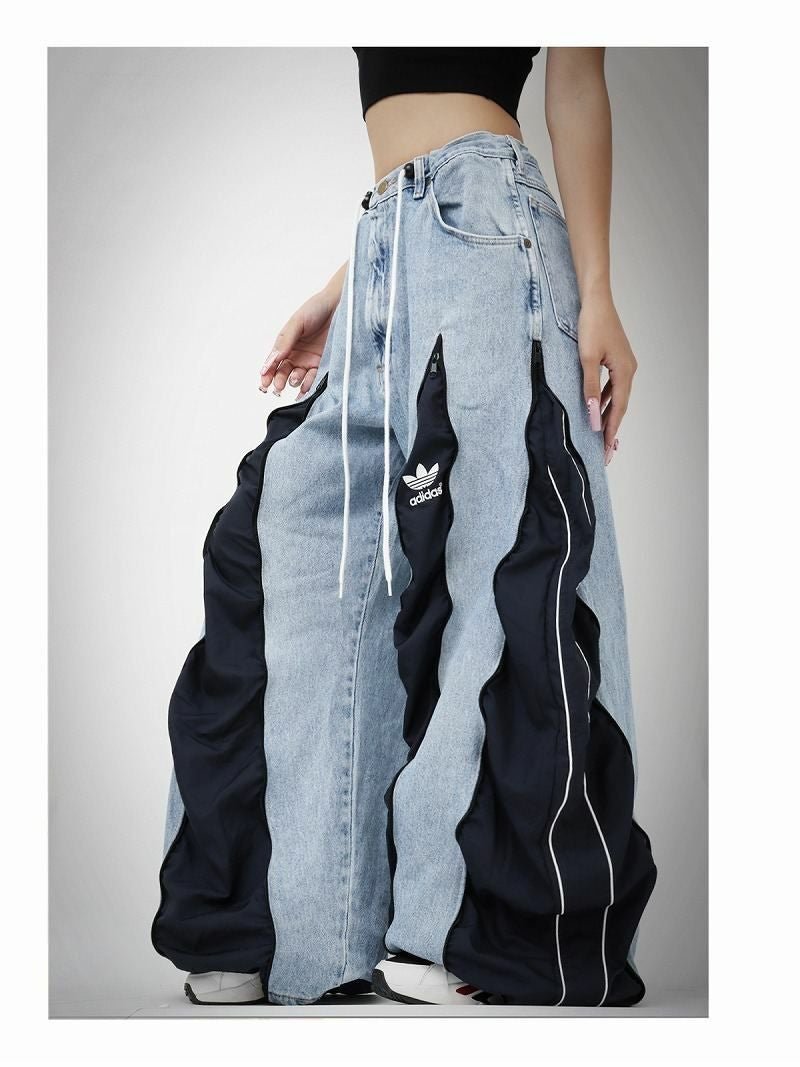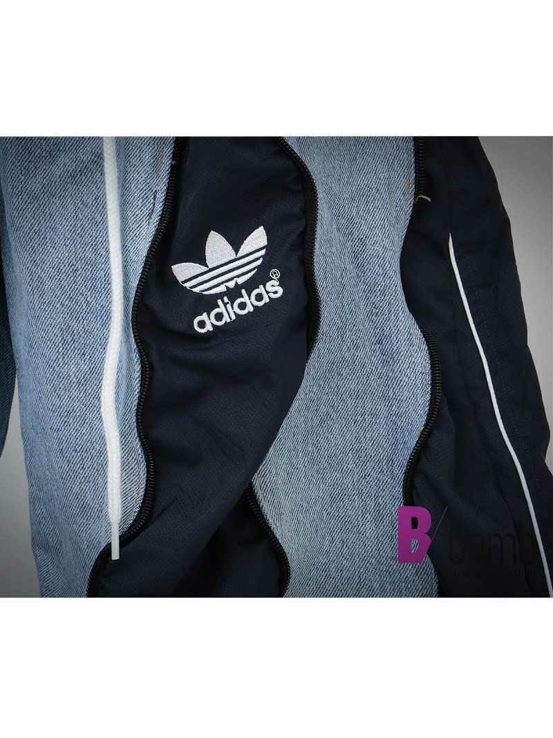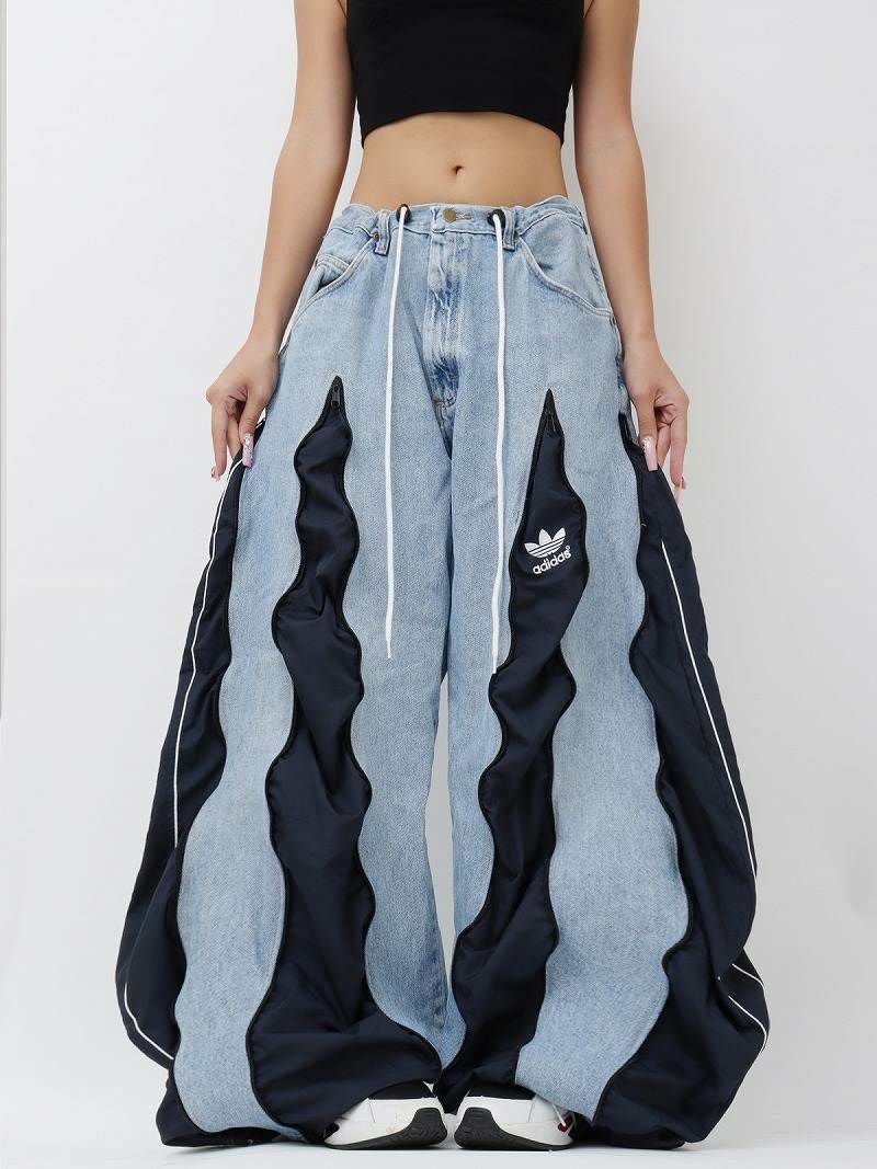 爽やかなミッドブルーのデニムに、落ち着いたネイビーのアディダスジャージをドッキングした、ウェーブ状の切り替えが特徴的な再構築ワイドパンツ。