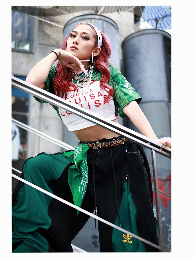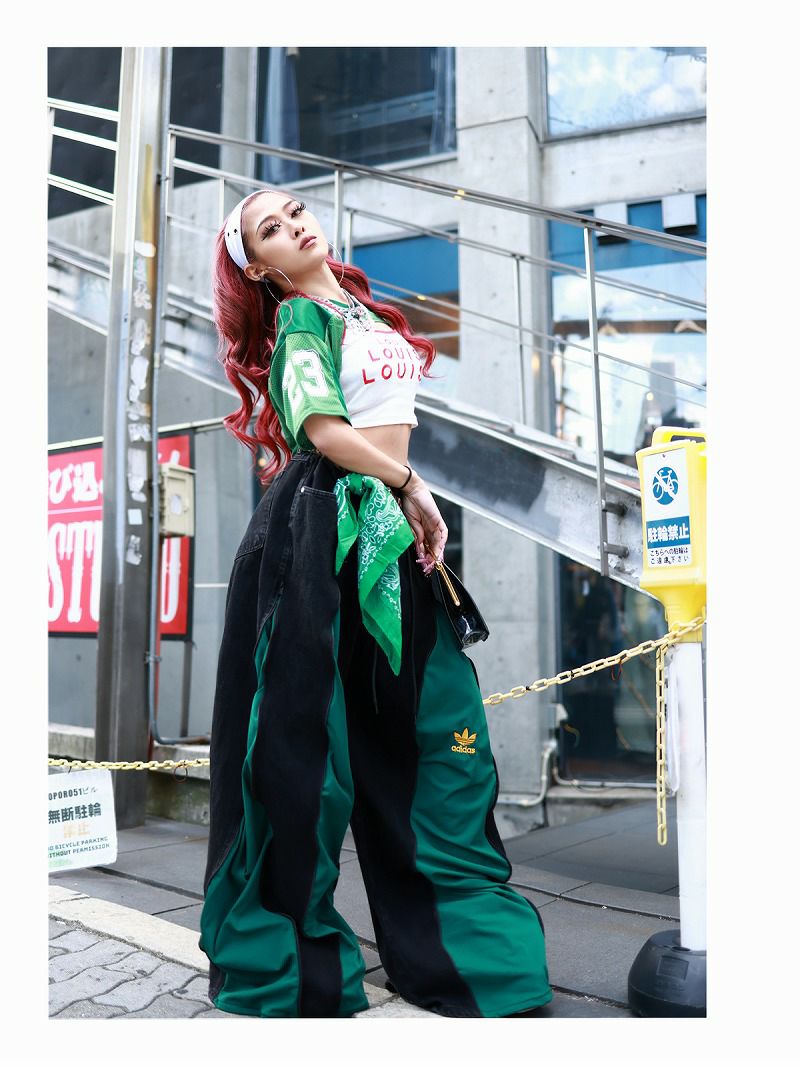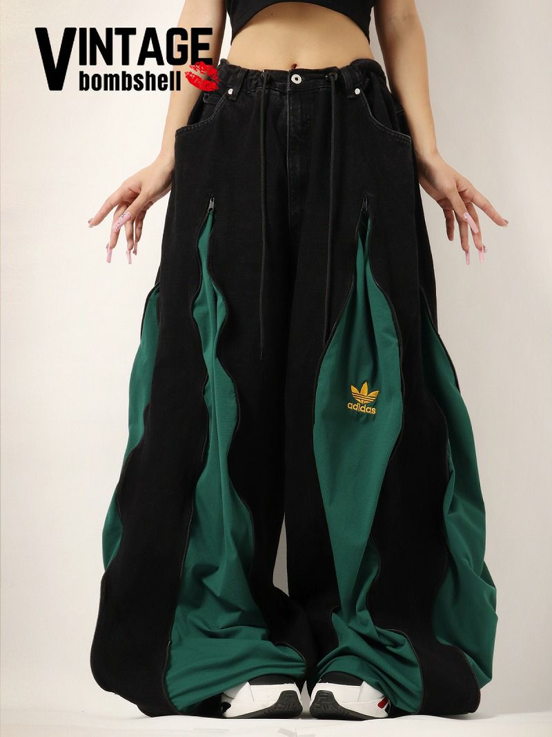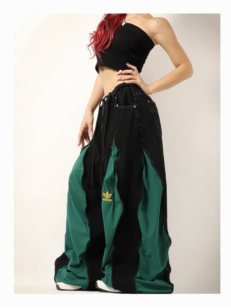 クールなブラックデニムに、落ち着いたグリーンのアディダスジャージをドッキングしたリメイクワイドパンツ。