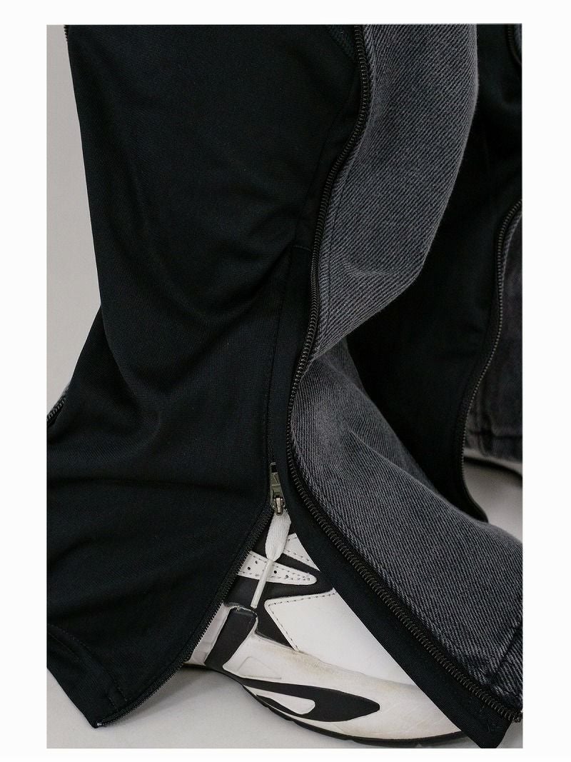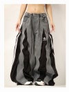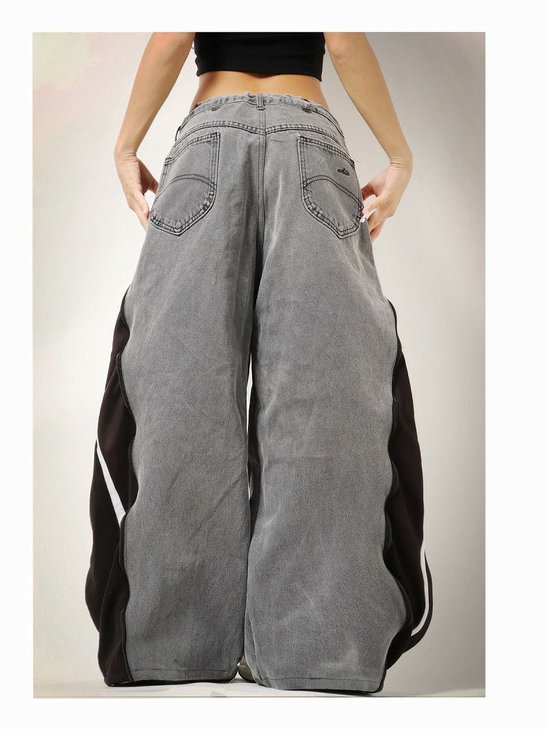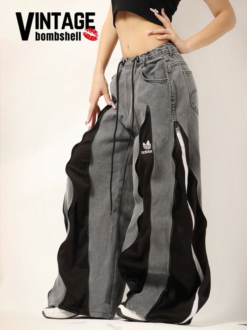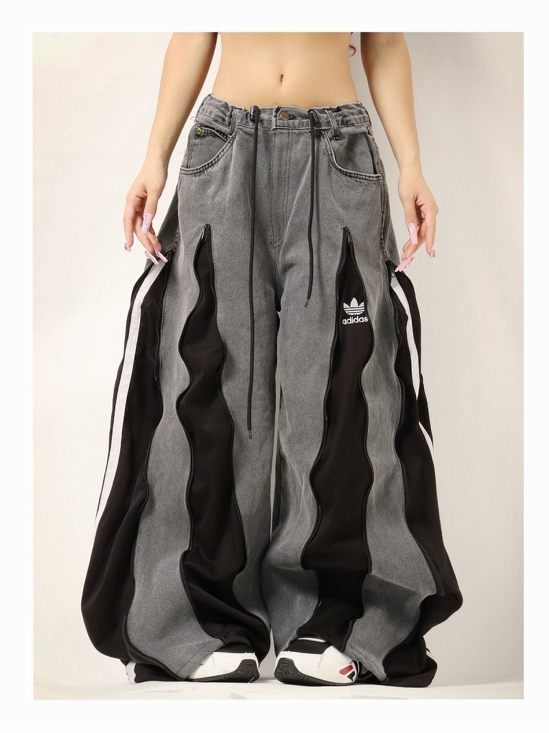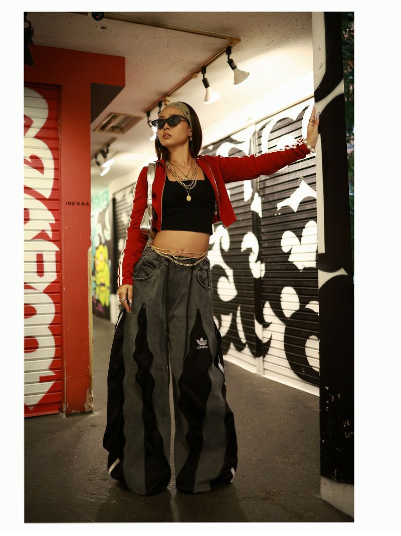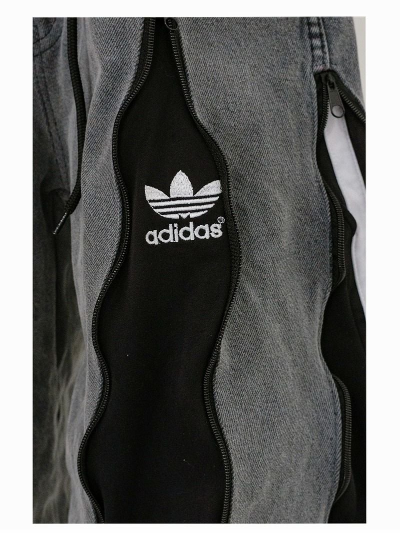 ウォッシュ加工を施したクールなグレーデニムに、定番のブラックadidasジャージをリメイク・再構築でドッキングしたワイドバギーパンツ。