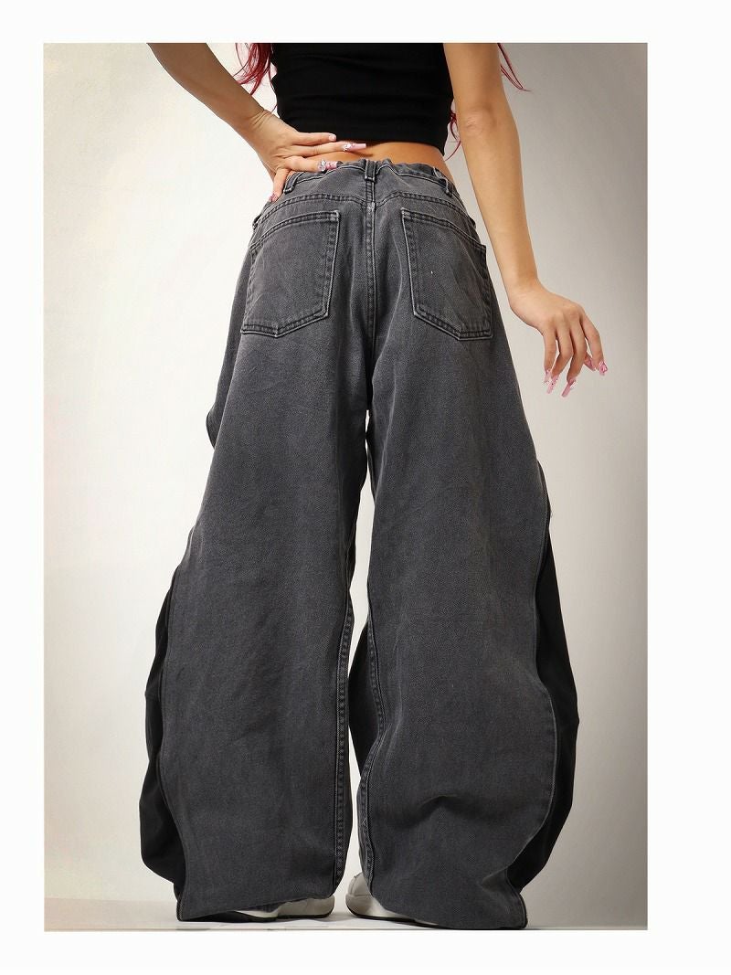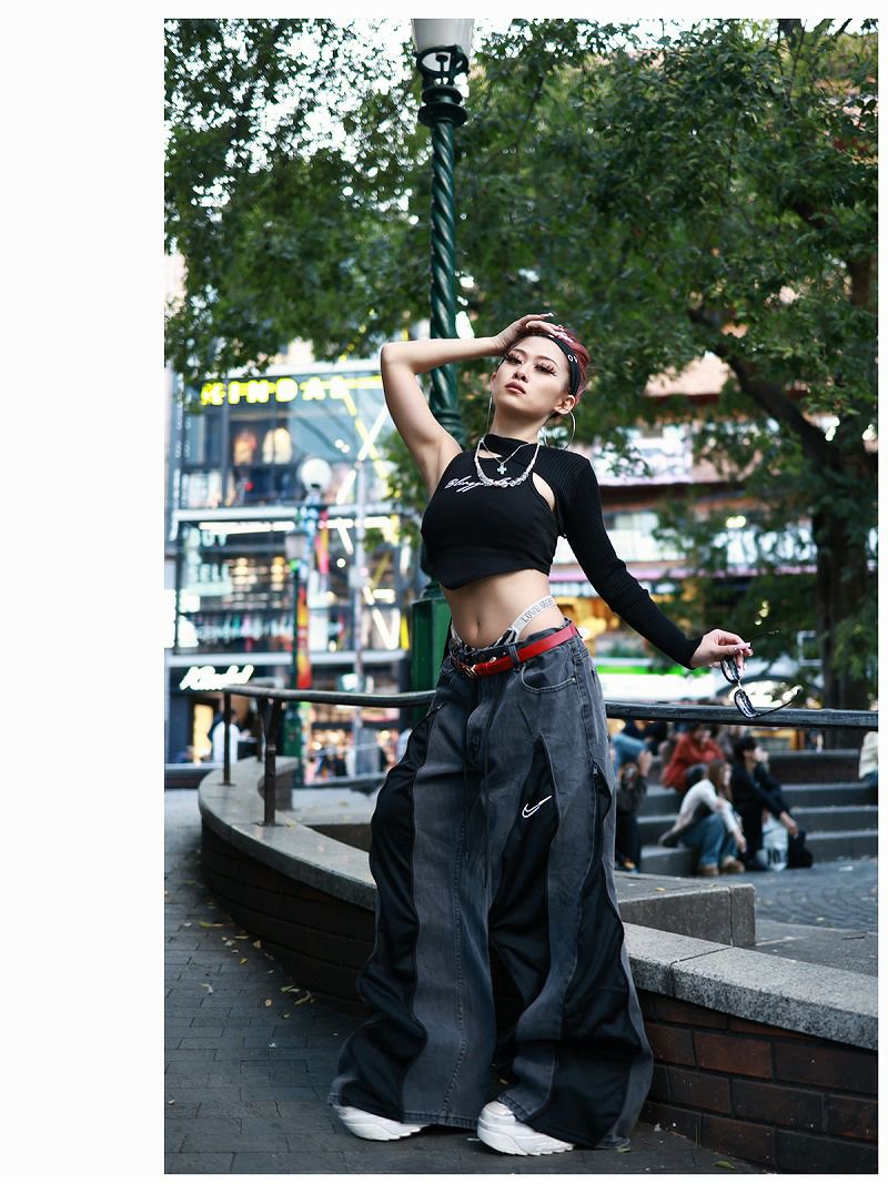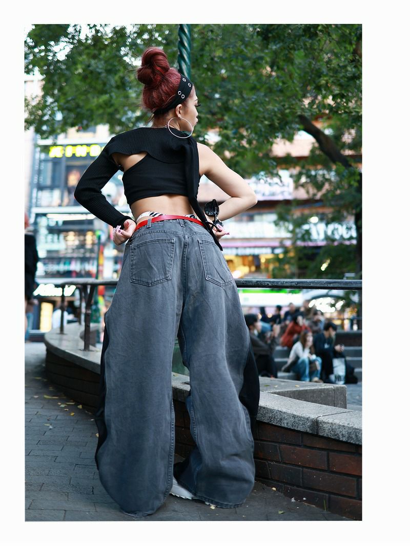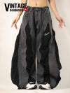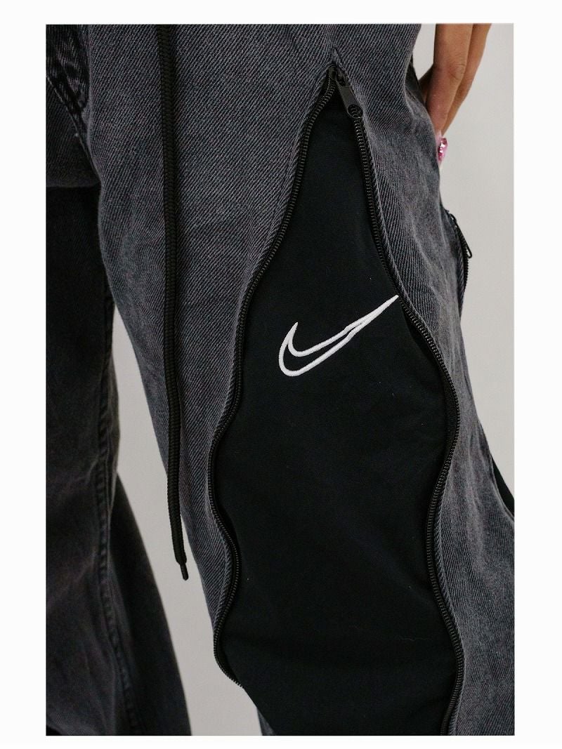 ウォッシュ加工を施したグレーデニムと、シックなブラックのNIKEジャージをリメイクでドッキングしたワイドバギーパンツ。