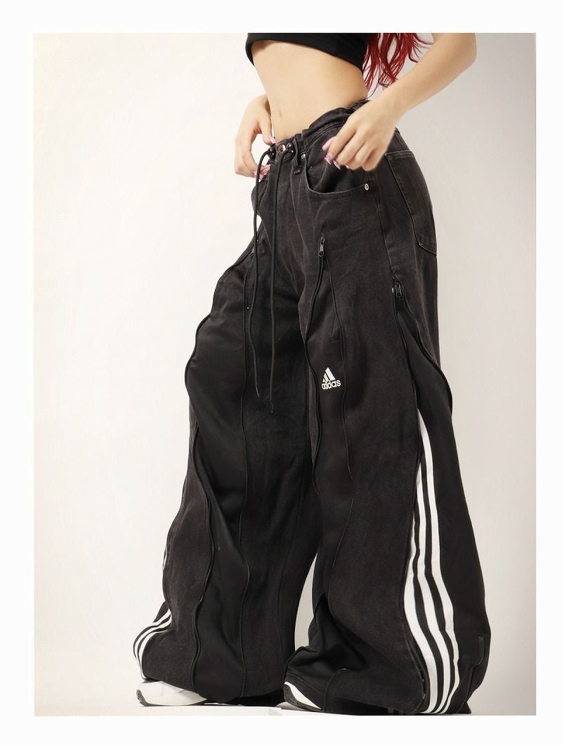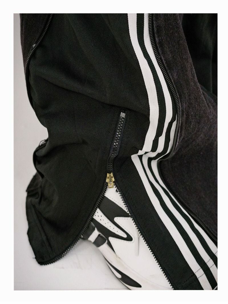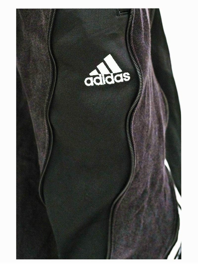 ブラックデニムにブラック×ホワイトのadidasジャージ素材を大胆にドッキングした、唯一無二の再構築ワイドパンツ。