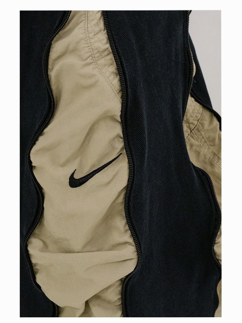 ブラックデニムと、カーキ(ベージュ系)のNIKE素材をドッキングした、個性的な再構築ワイドバギーパンツ。
