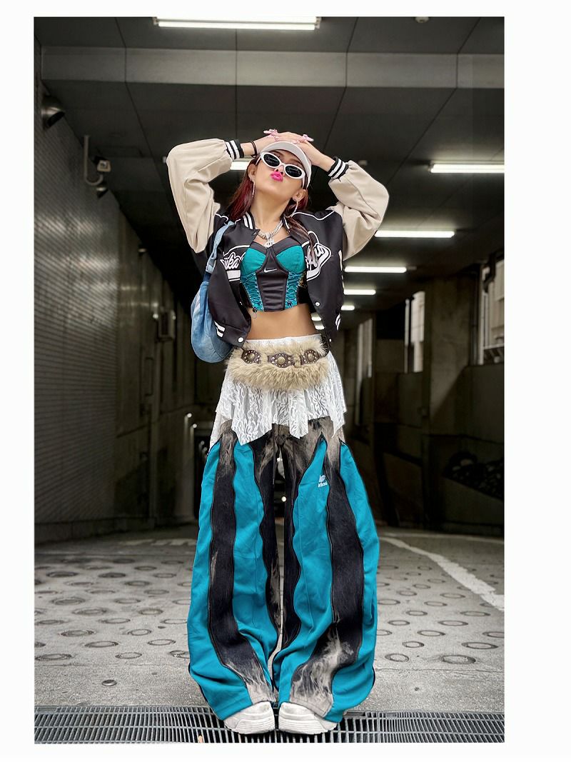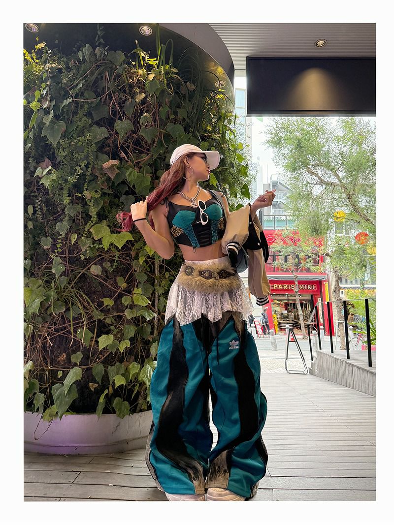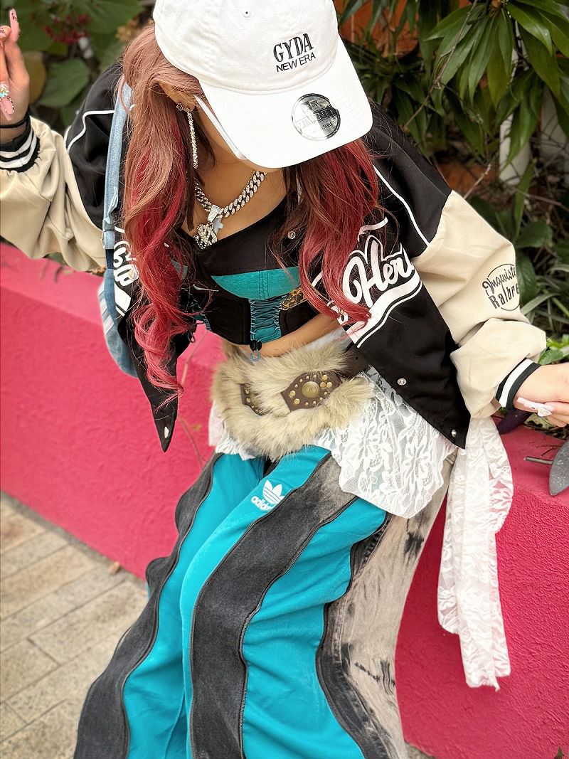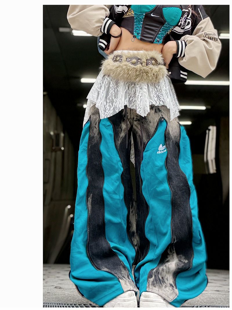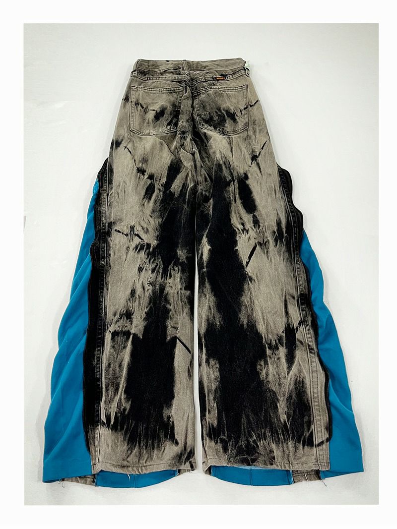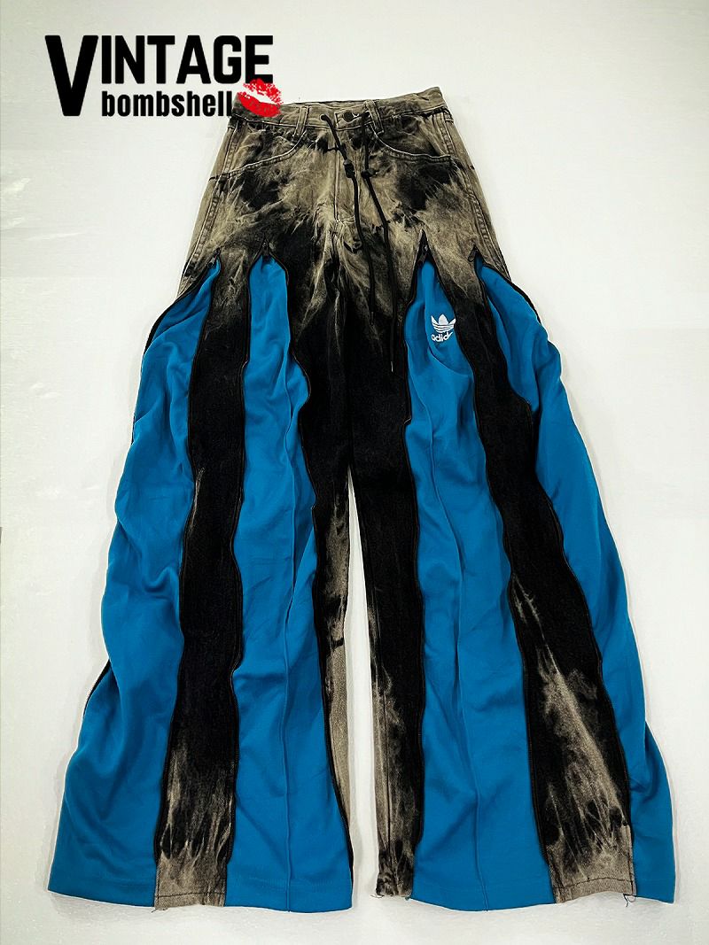 黒とグレーのタイダイ(ブリーチ)加工が施されたデニムと、鮮やかなターコイズ(ブルー)のadidasジャージ素材を組み合わせた、個性あふれる再構築リメイクパンツ。