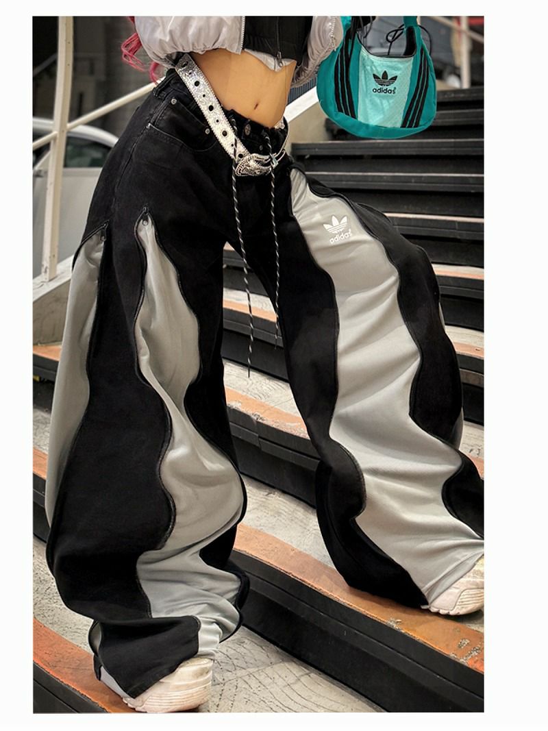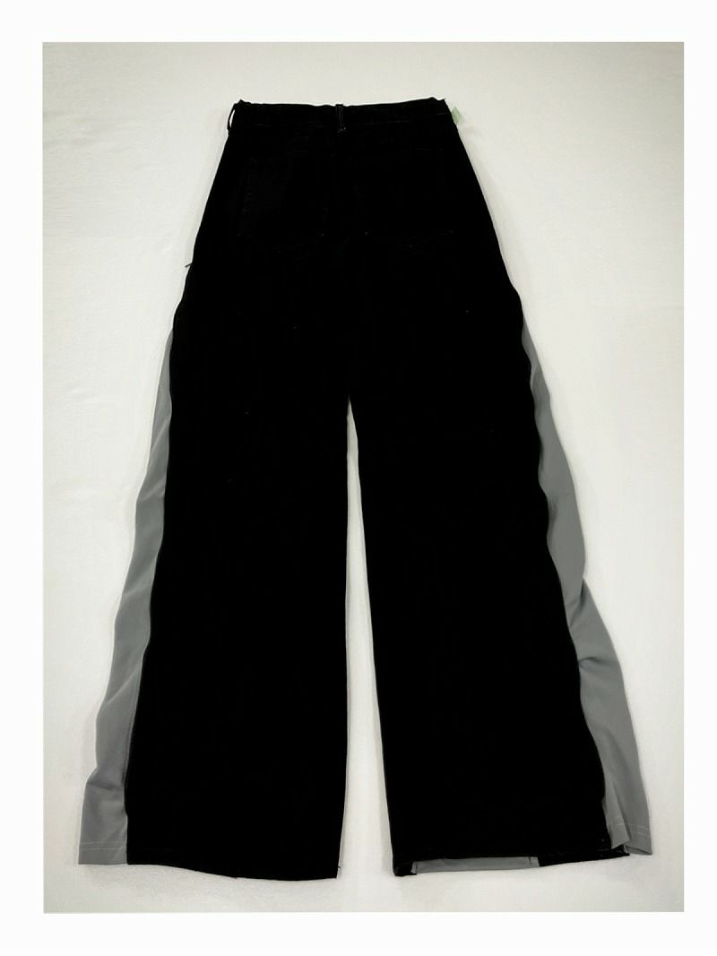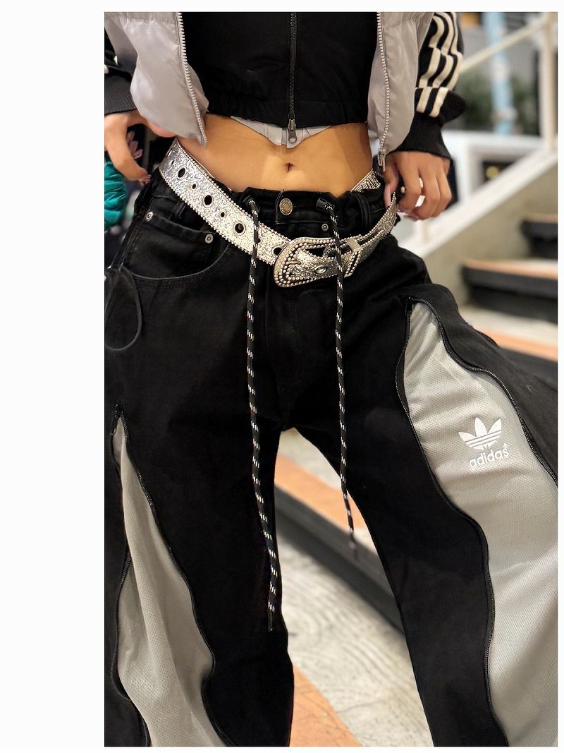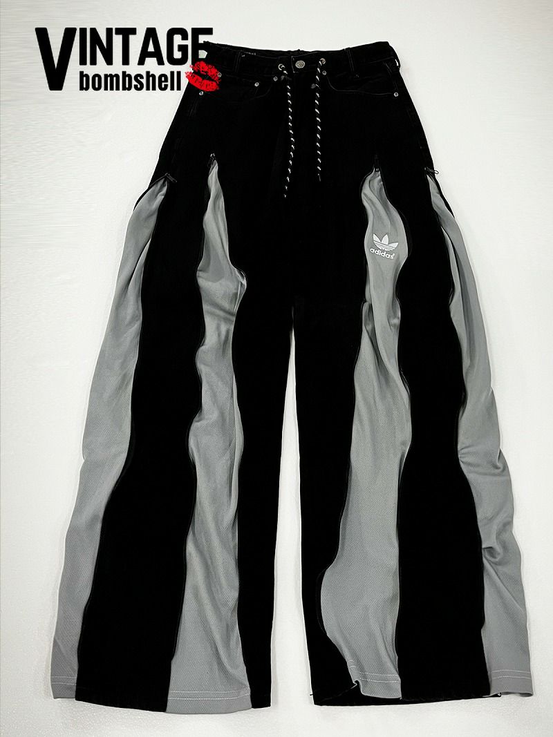 ブラックデニムをベースに、サイドにグレーのメッシュアディダスジャージ素材を大胆にドッキングした再構築ワイドパンツ。