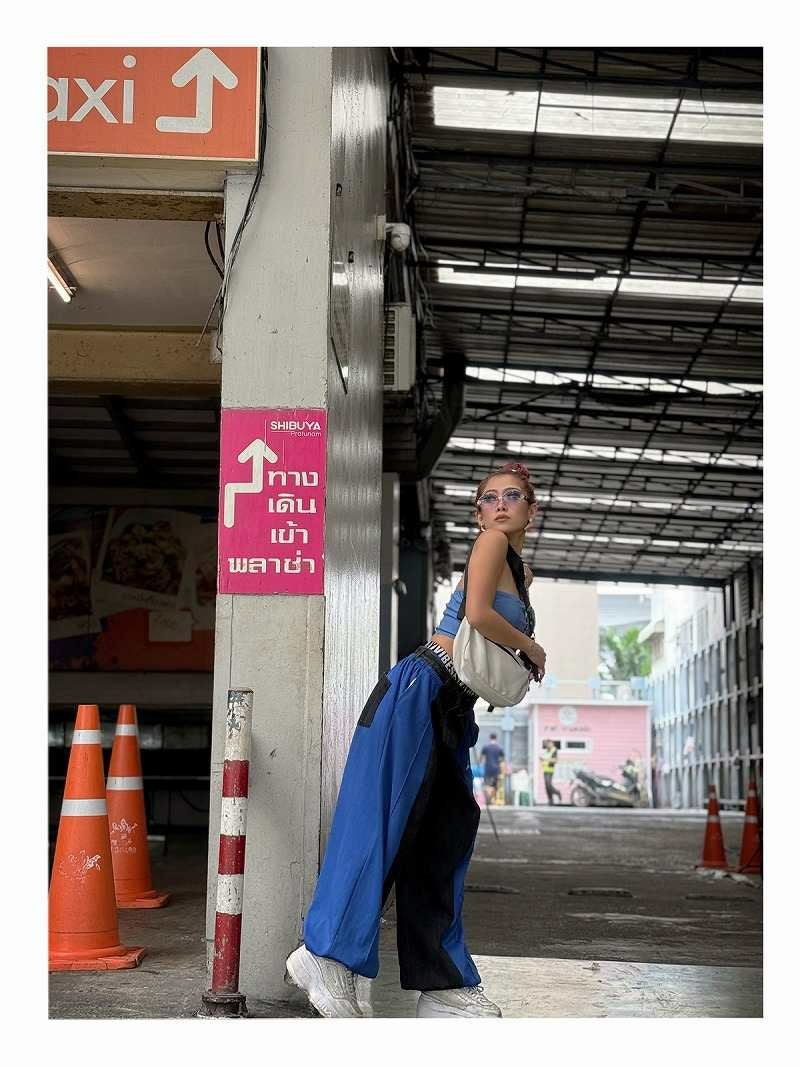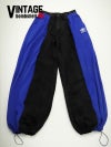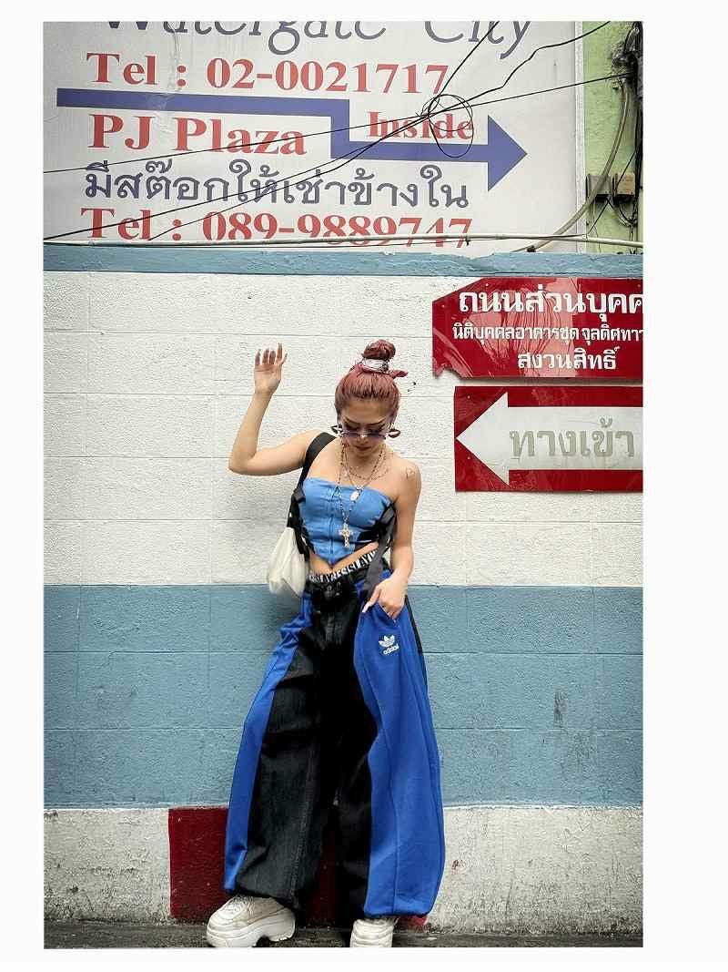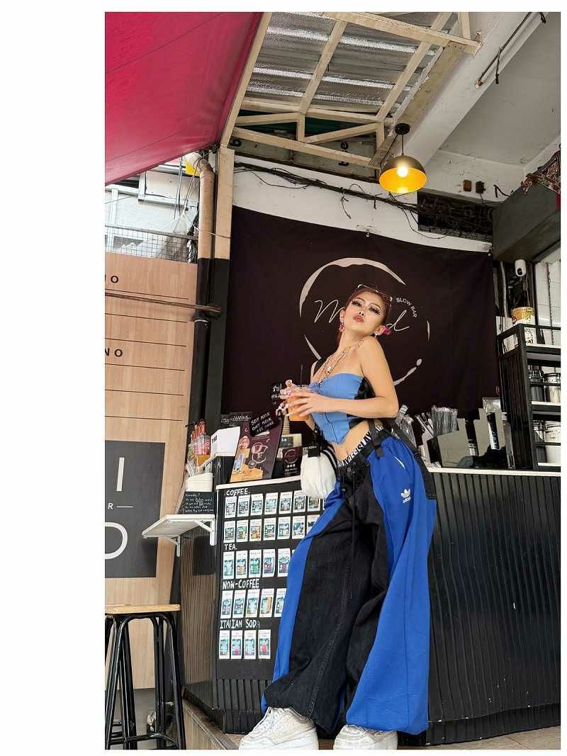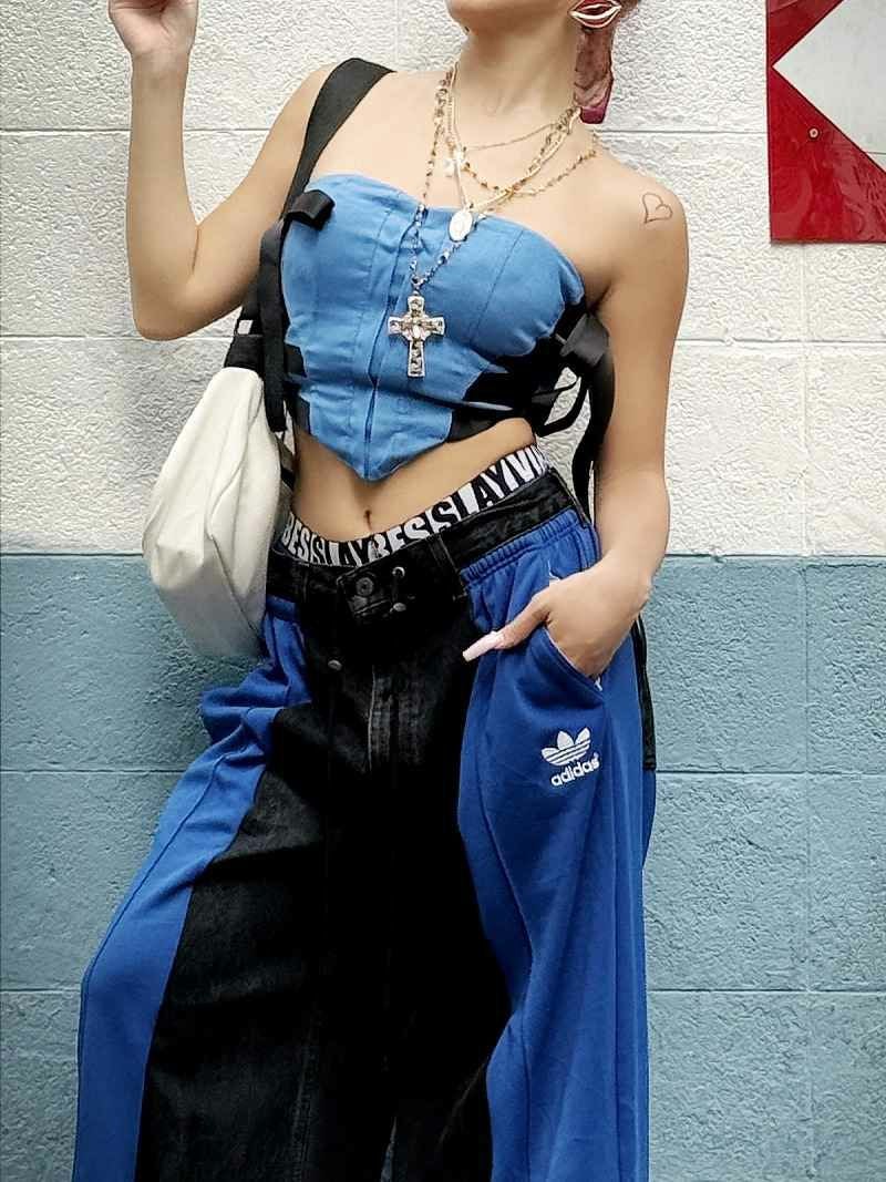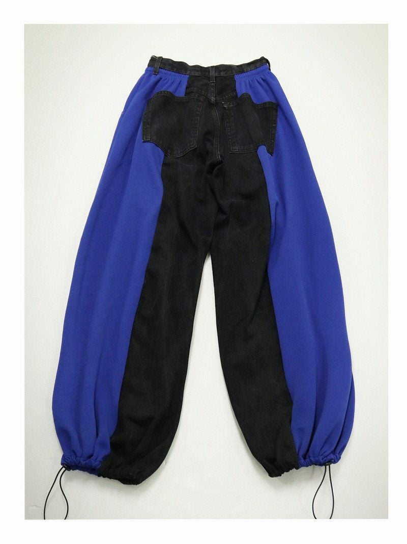 センターにブラックデニム、サイドに鮮やかなブルーのアディダスジャージを大胆に配置した、存在感抜群の再構築バギーパンツです。