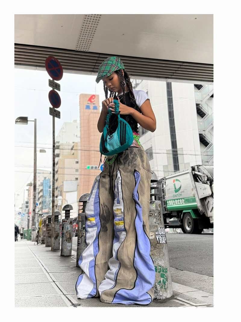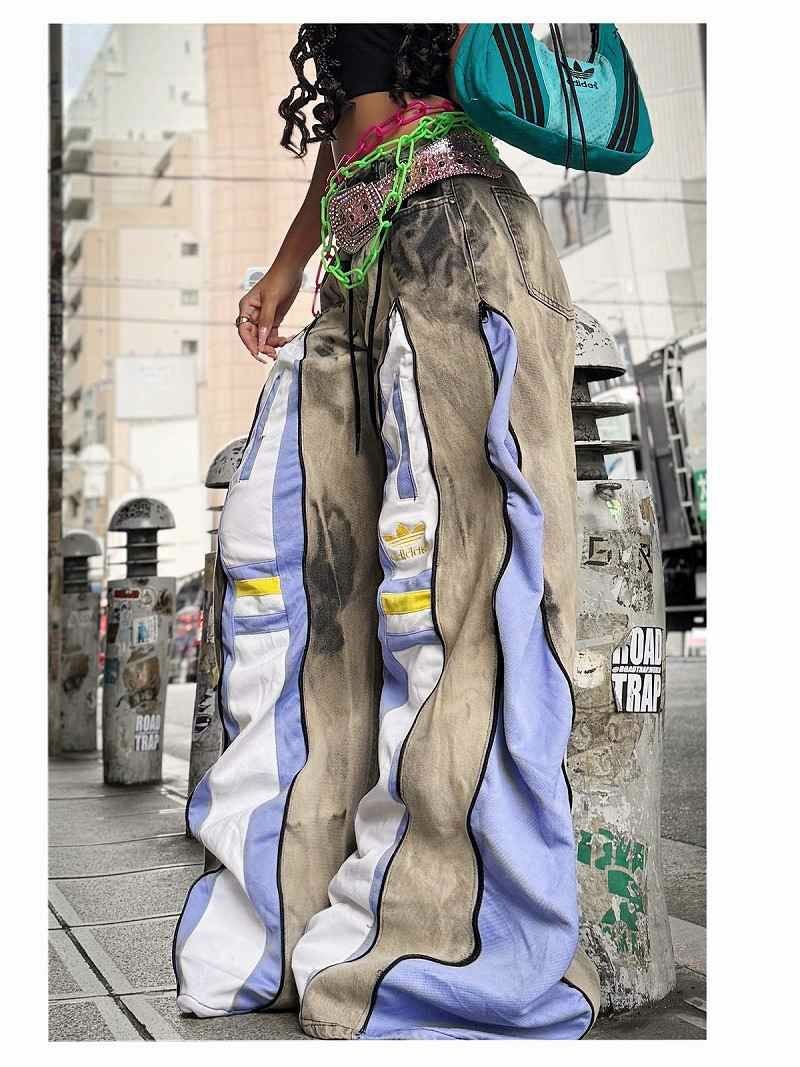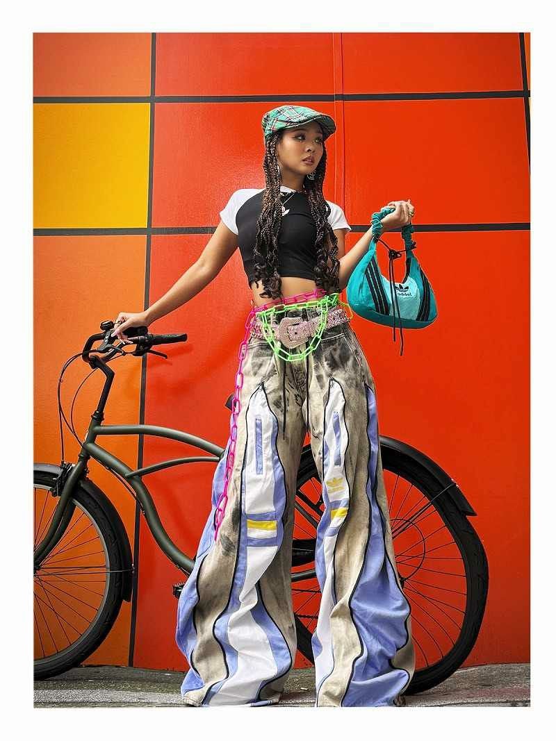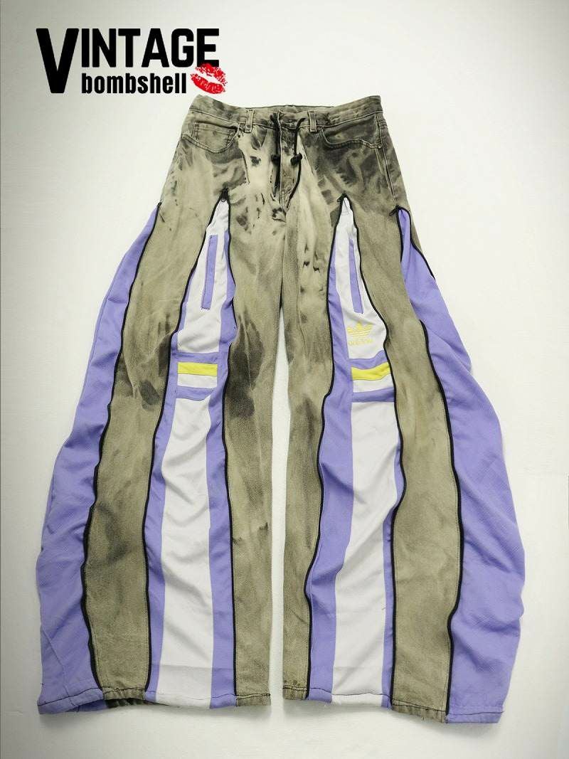 ヴィンテージ感漂うケミカルウォッシュデニムに、淡いラベンダーとホワイトのadidasジャージをドッキングした、唯一無二の再構築ワイドパンツ。 フロントに配された4本のジッパーを開閉することで、インナーのジャージの見え方をコントロールし、タイトなラインから迫力のある超ワイドシルエットまで自由自在にアレンジ可能です。 ジャージ部分にあしらわれたイエローのラインとゴールドのロゴが、絶妙な差し色としてストリート映えを約束。 ルーズなバギーシルエットは足さばきが良く、ダンスのキレを視覚的に強調してくれるため、ステージ衣装や本格的なレッスン着としても高く評価されています。 トレンドのY2Kムードと韓国ストリートの感性を融合させた、誰とも被らない1点物のマスターピースです。