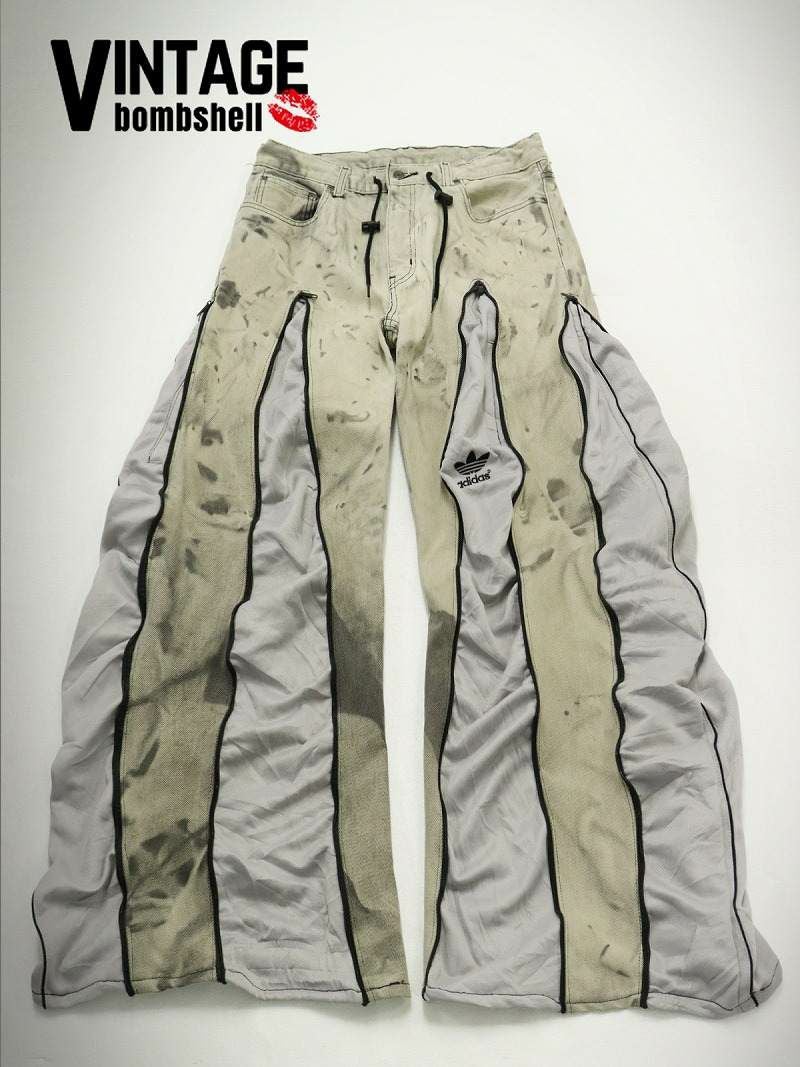 絶妙な色落ち加減のベージュ系ケミカルウォッシュデニムに、洗練されたグレーのadidasジャージをドッキングした、モダンな印象のリメイクワイドパンツ。
