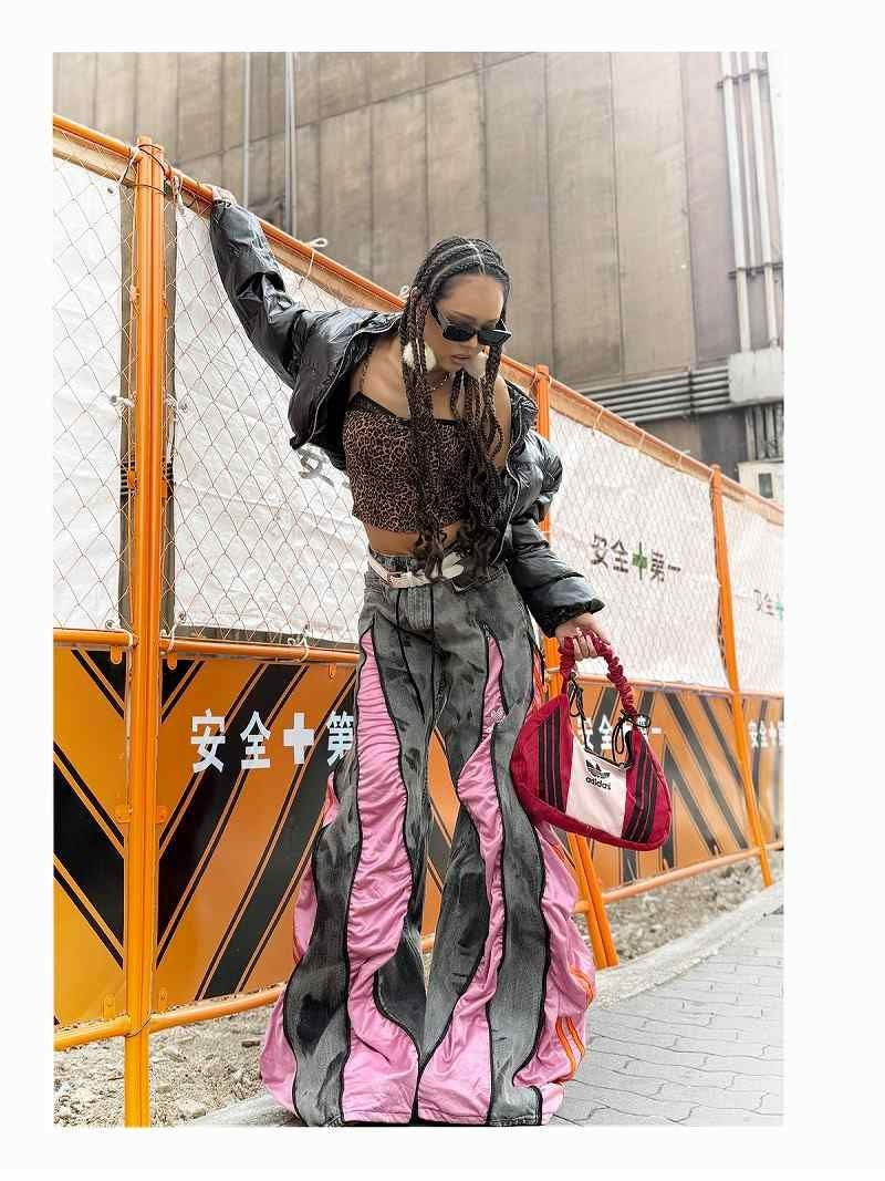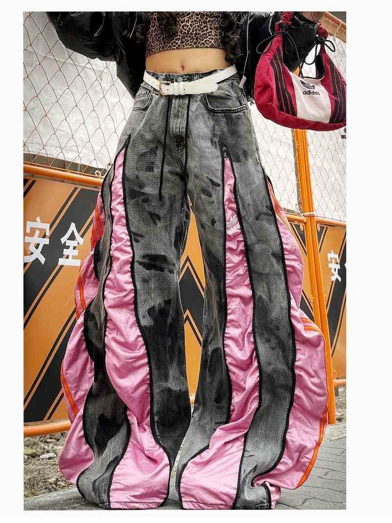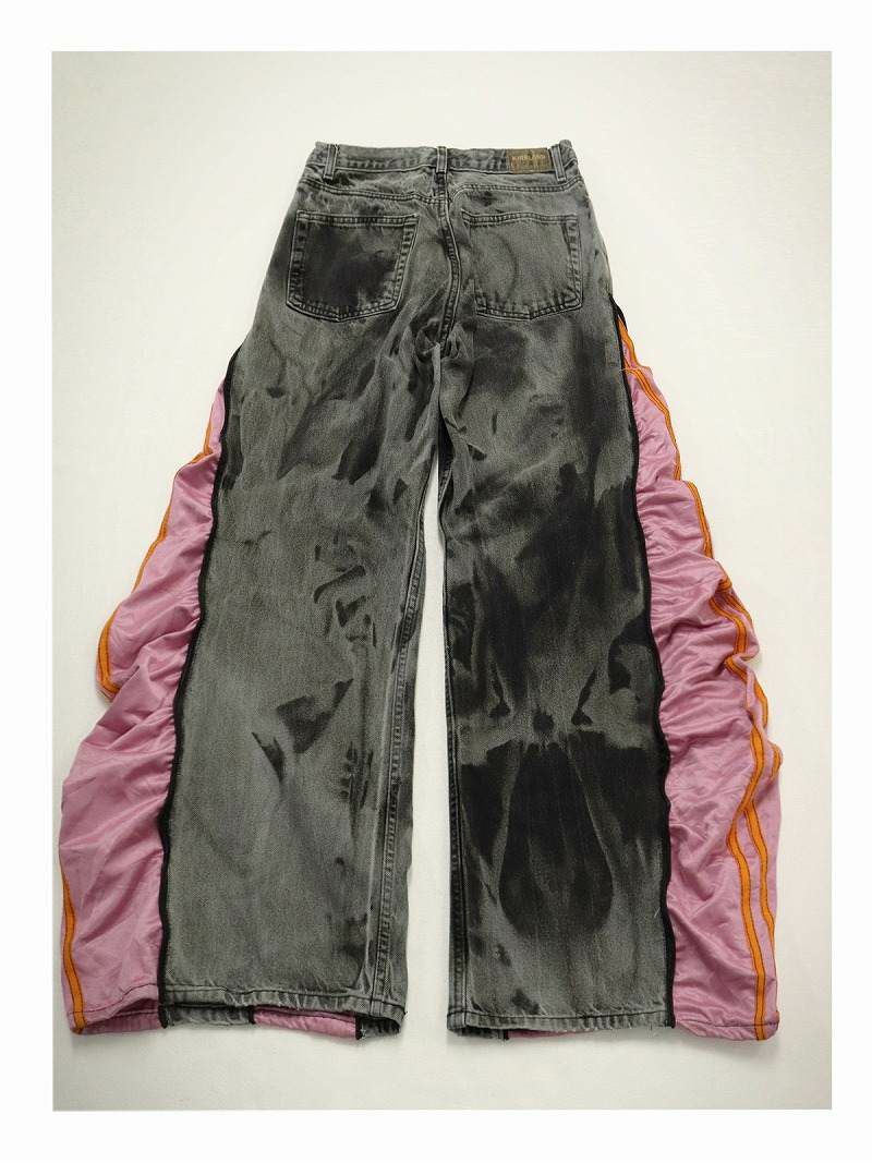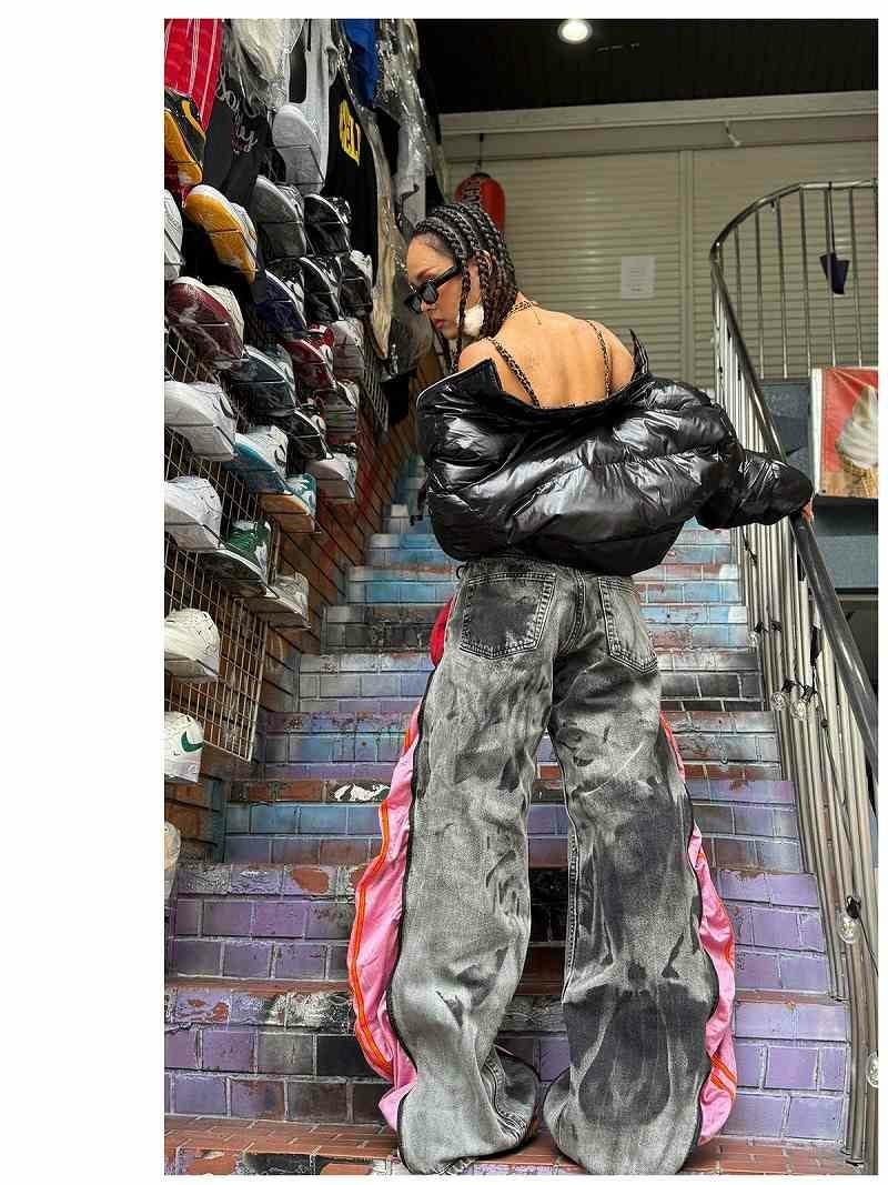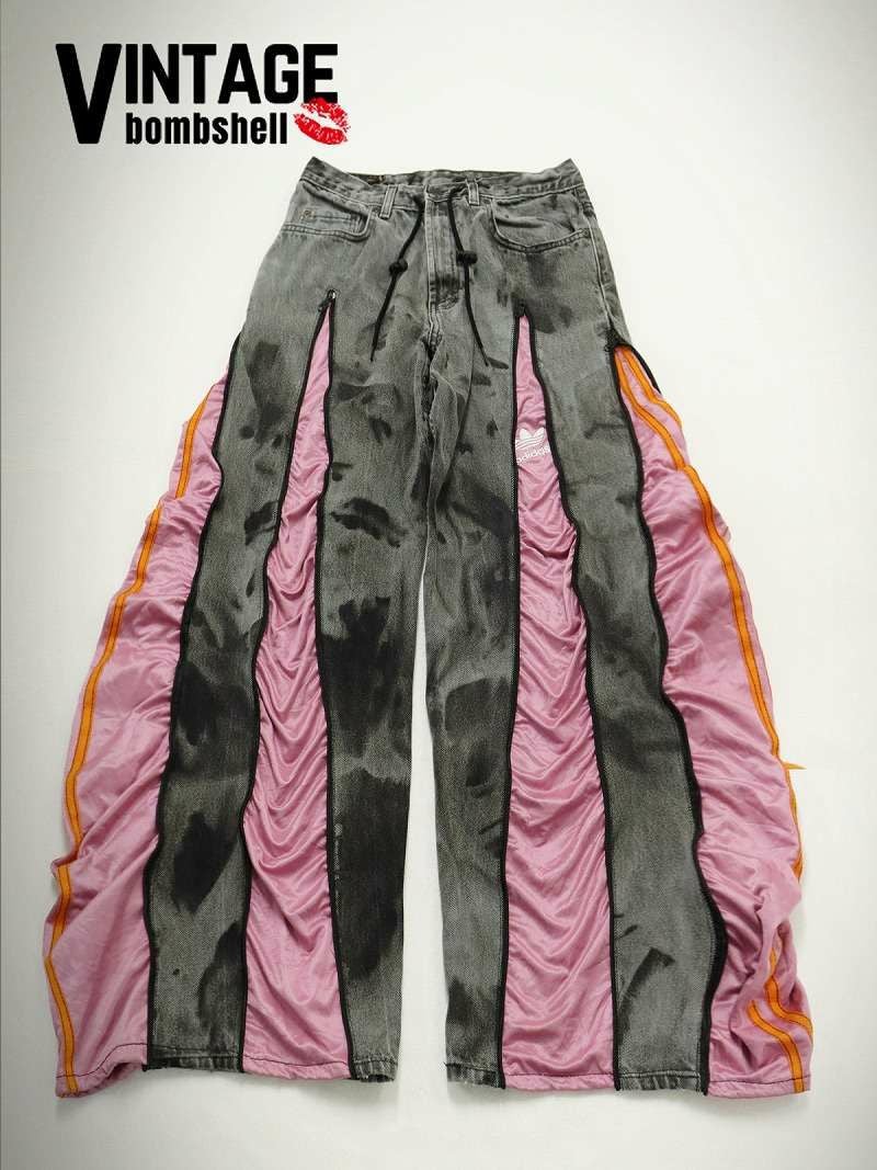 重厚感のあるグレーのケミカルウォッシュデニムに、鮮やかなピンクのadidasジャージを融合させた、エッジの効いた再構築ワイドパンツ。