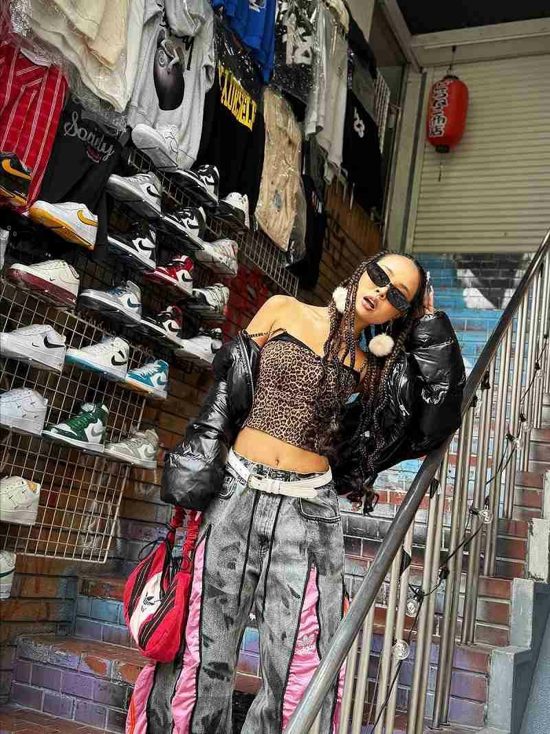デニムのタフな質感とジャージの軽快さを兼ね備えており、激しいダンスムーブでもシルエットが崩れず、ステージ上でのパフォーマンスを最大化。
