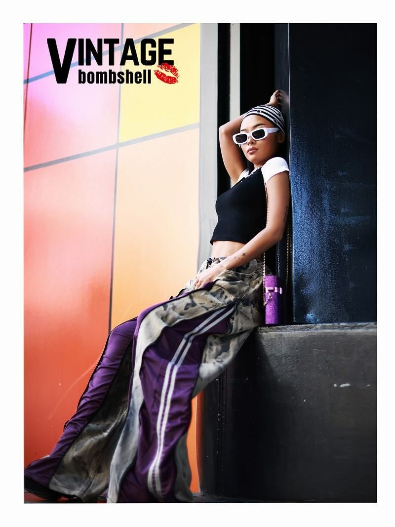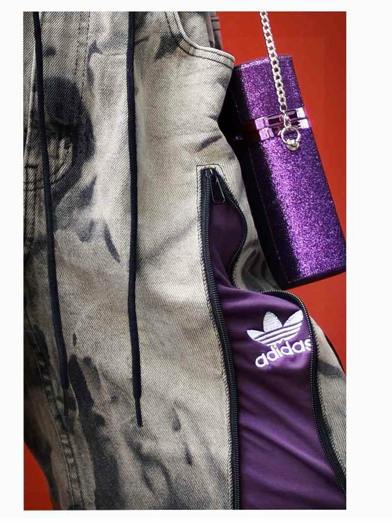 重厚なベージュ系のケミカルウォッシュデニムに、深みのあるパープルのadidasジャージをドッキングした、ストリート感溢れる再構築ワイドパンツ。
