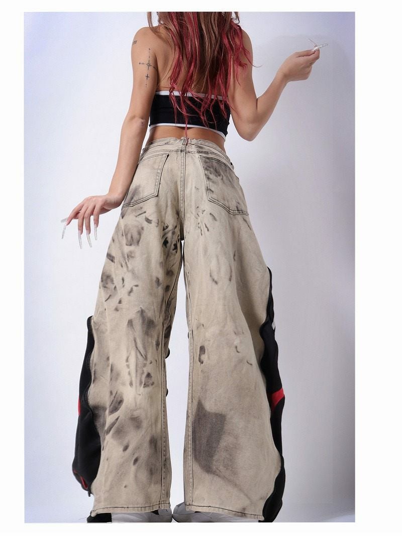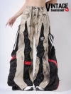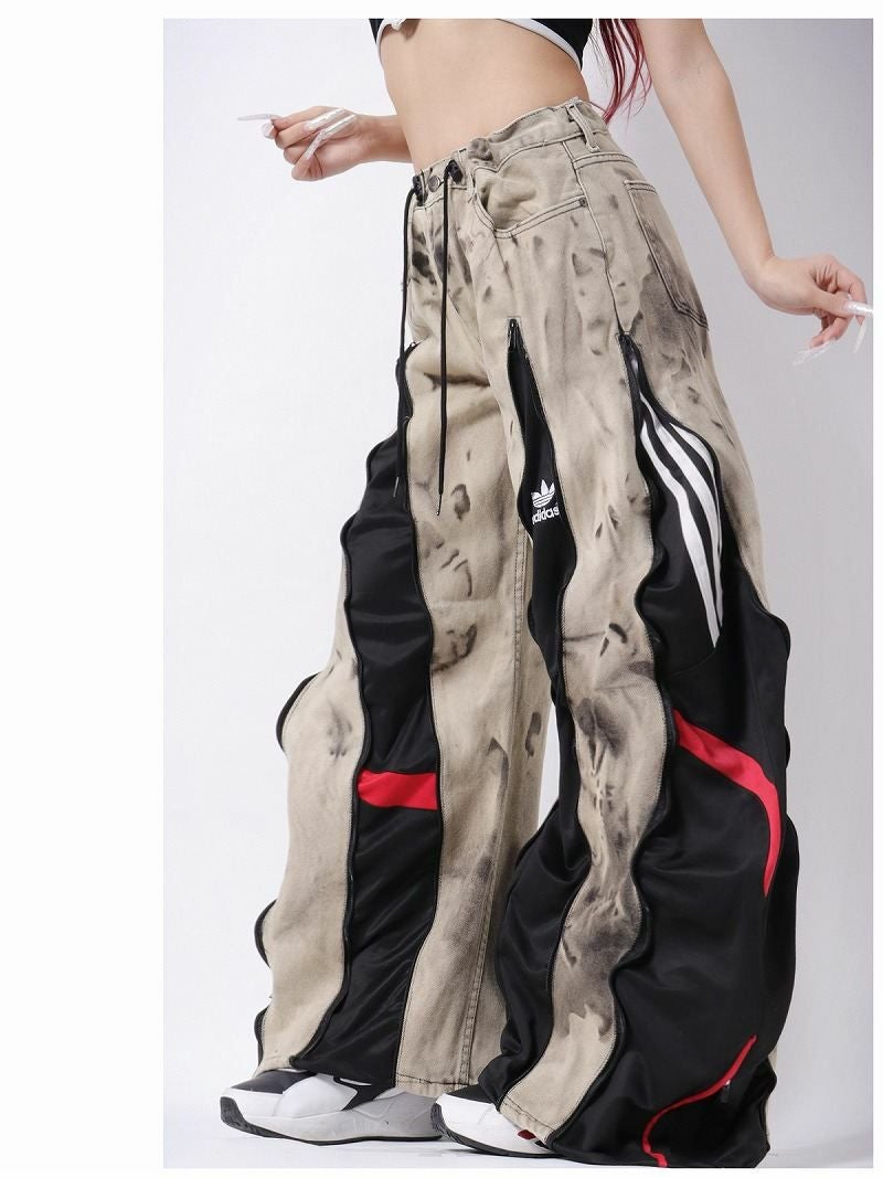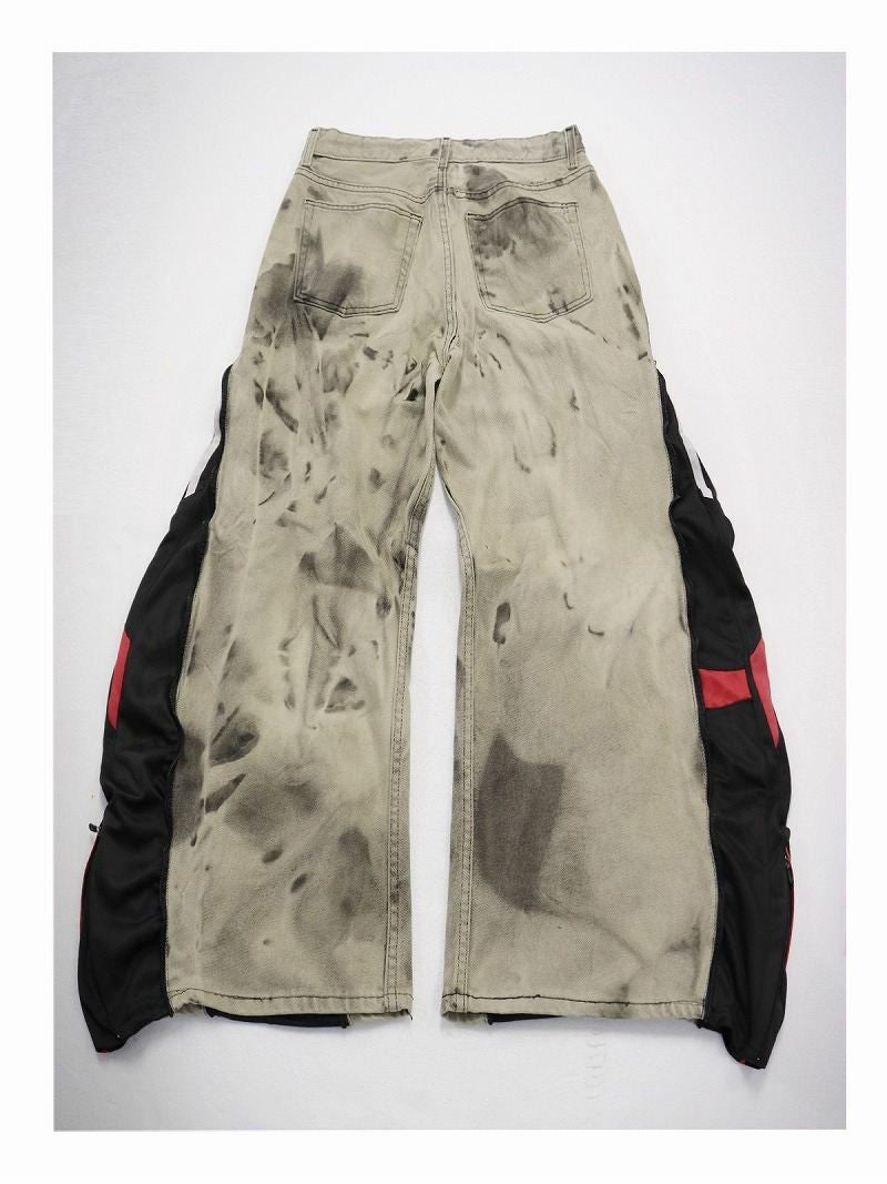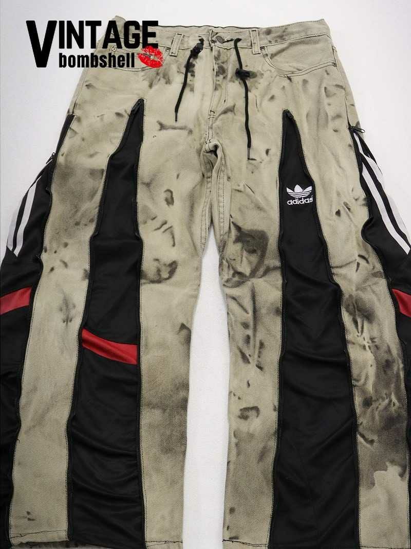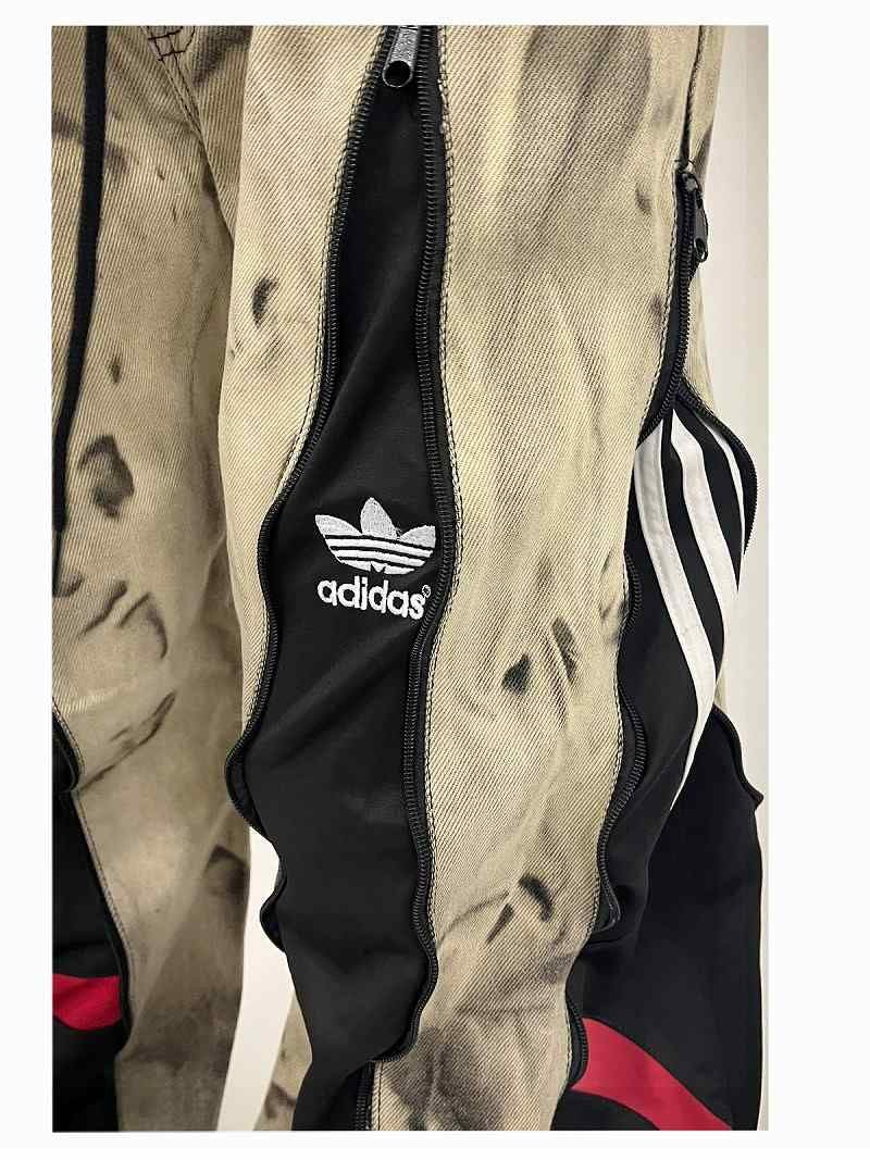 ベージュのタイダイ染めデニムに、ブラック×レッドのadidasジャージを大胆にドッキングした超個性派リメイクパンツ。