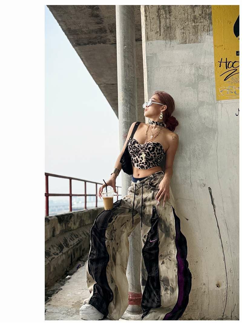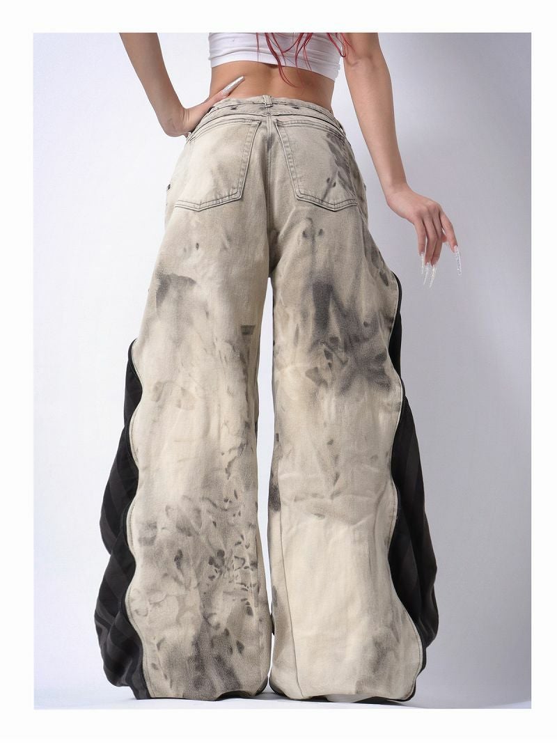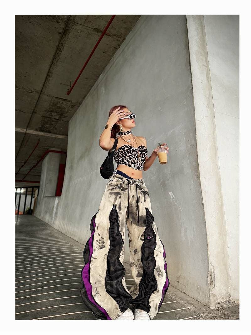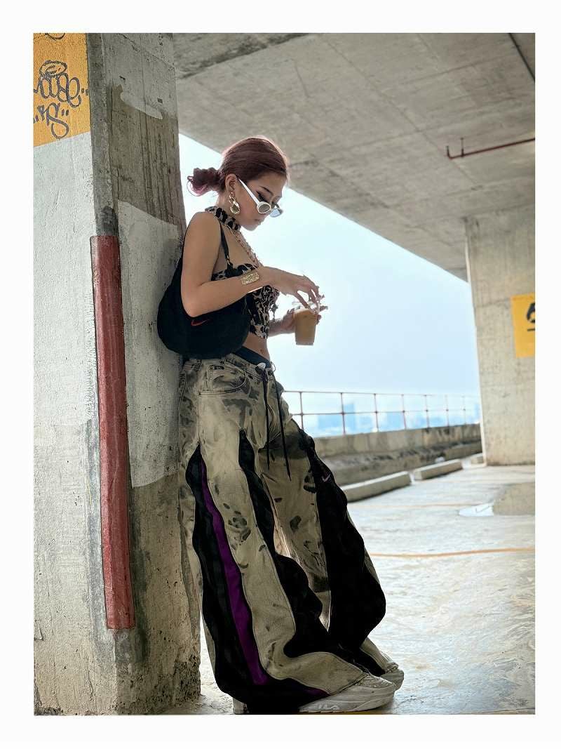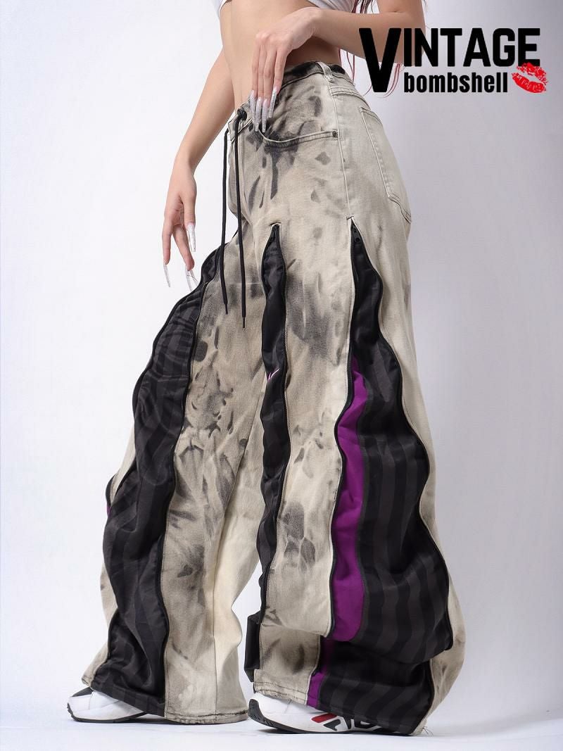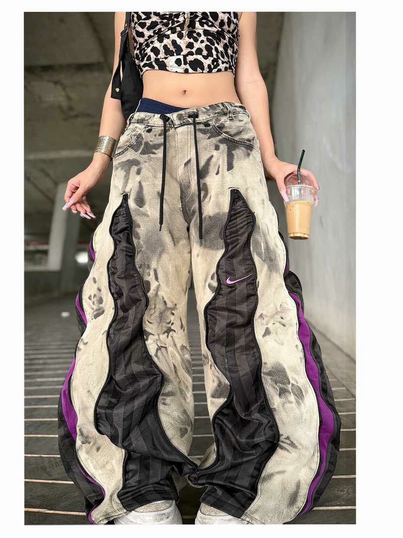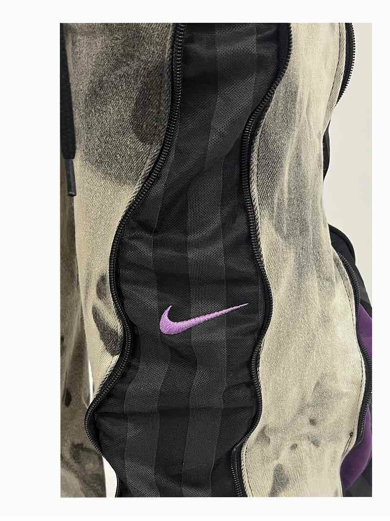 淡く絶妙なニュアンスのアイボリーのタイダイに黒ジャージ!NIKEロゴ&サイドのラインに鮮やかなパープルがワンポイント!のカラーリングが目を引く、ハイセンスな再構築バギーパンツです。