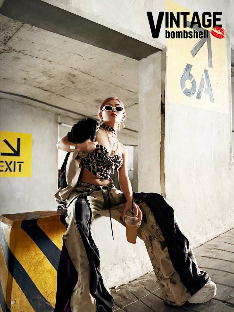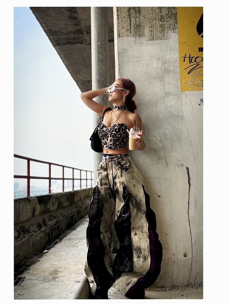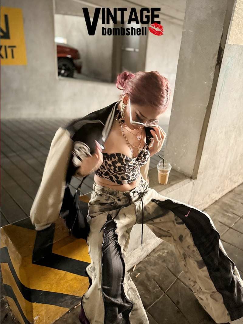 落ち着いたアイボリーとブラックのベースに、パープルの差し色が映えるこのデザインは、韓国ストリートやY2Kスタイルの主役として圧倒的な存在感を放ちます。
