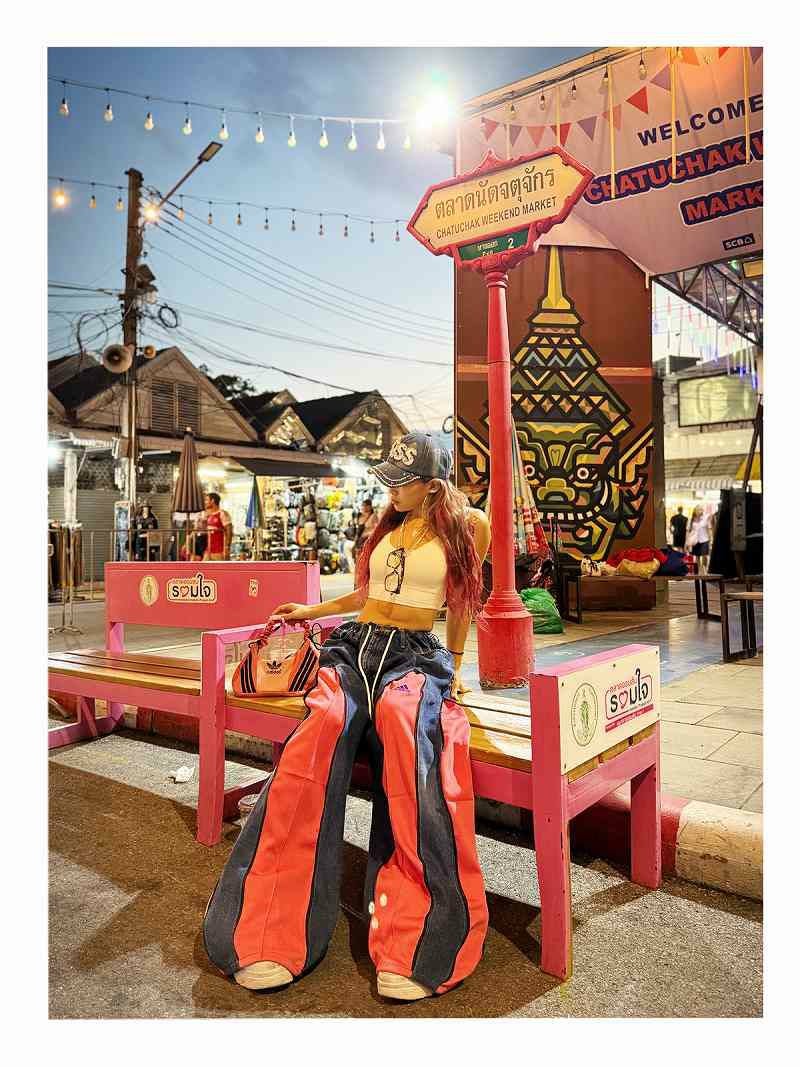 綺麗なブルーデニム×人気のサーモンピンク!ロゴがパープルなので女の子らしさUPな配色が、ダンスフロアやSNSで圧倒的に可愛く映えます。