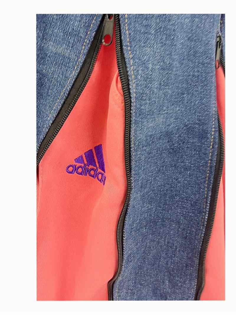 発色の良い綺麗なブルーデニムに、絶大な支持を得るサーモンピンクのadidasジャージをドッキングした、ポップでストリートな再構築バギーパンツです。