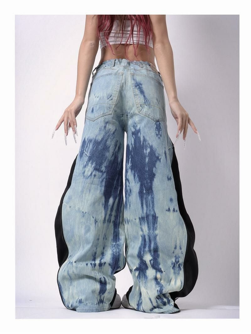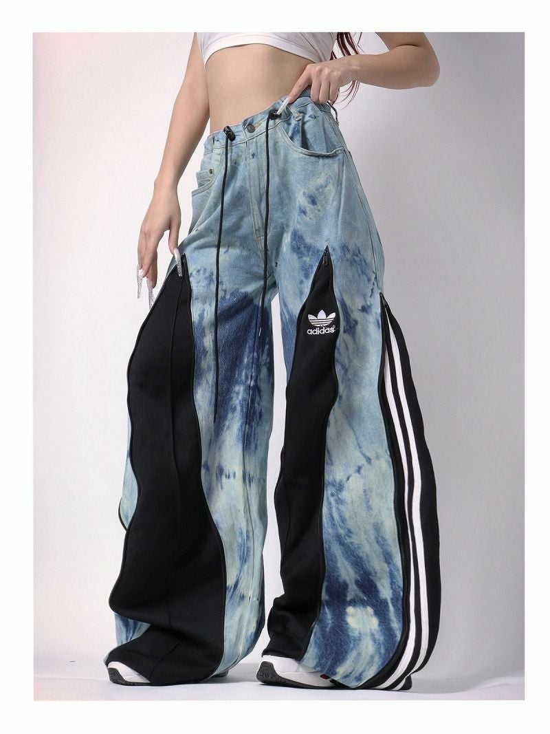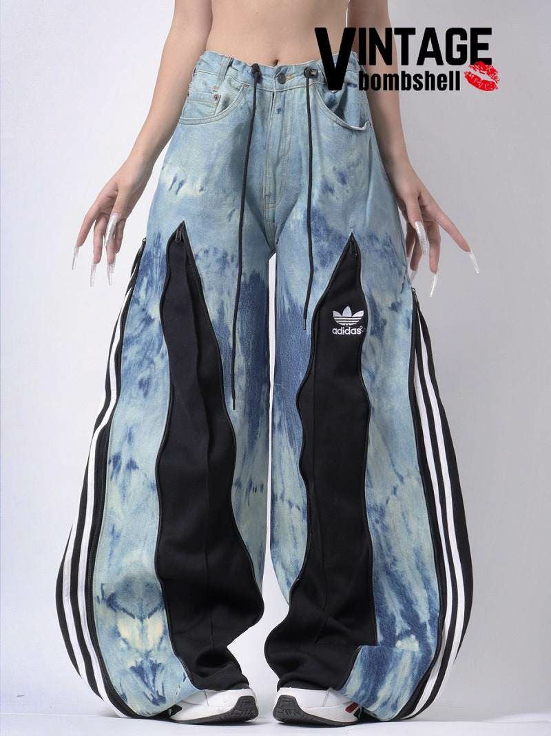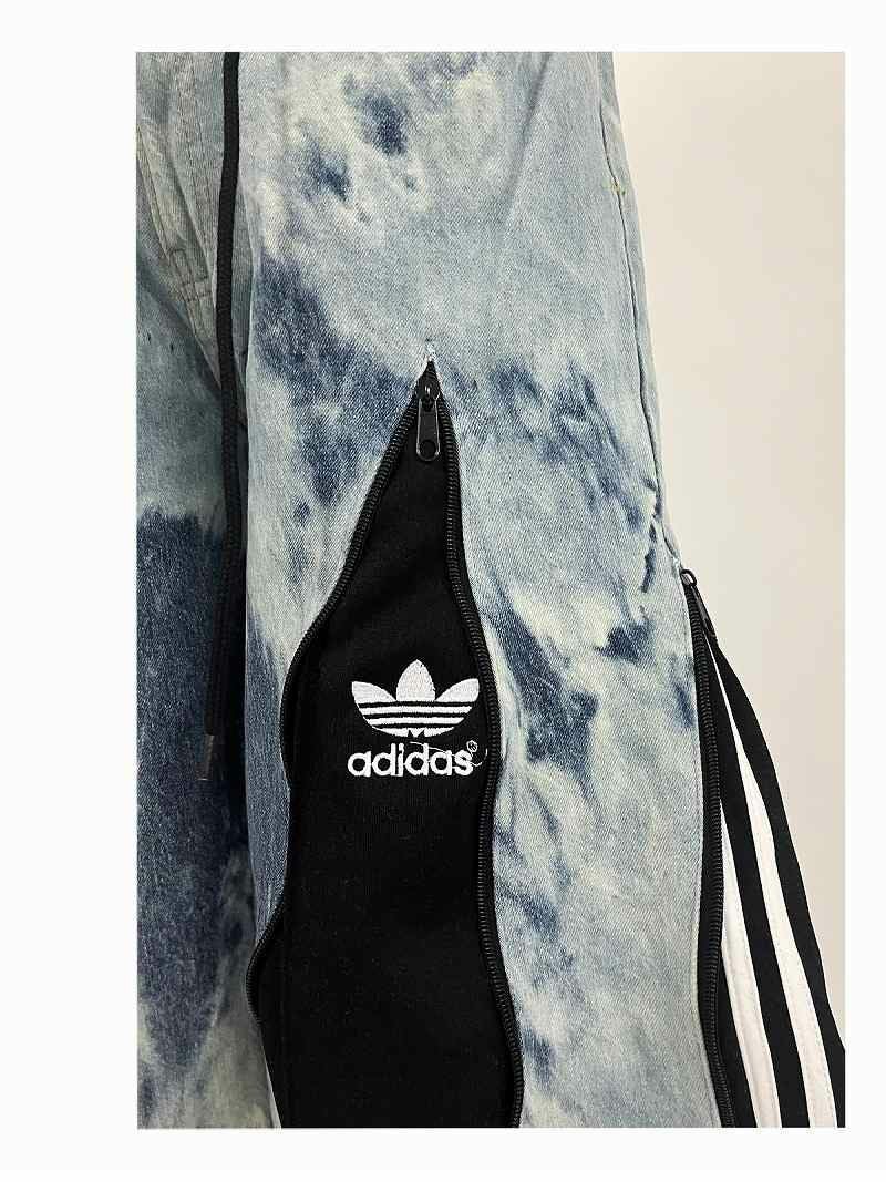 淡いブルーのムラ染め加工が目を引くデニムに、ブラックのadidasジャージをドッキングさせた唯一無二の再構築バギーパンツ。