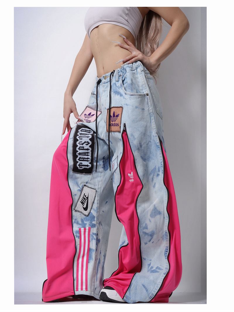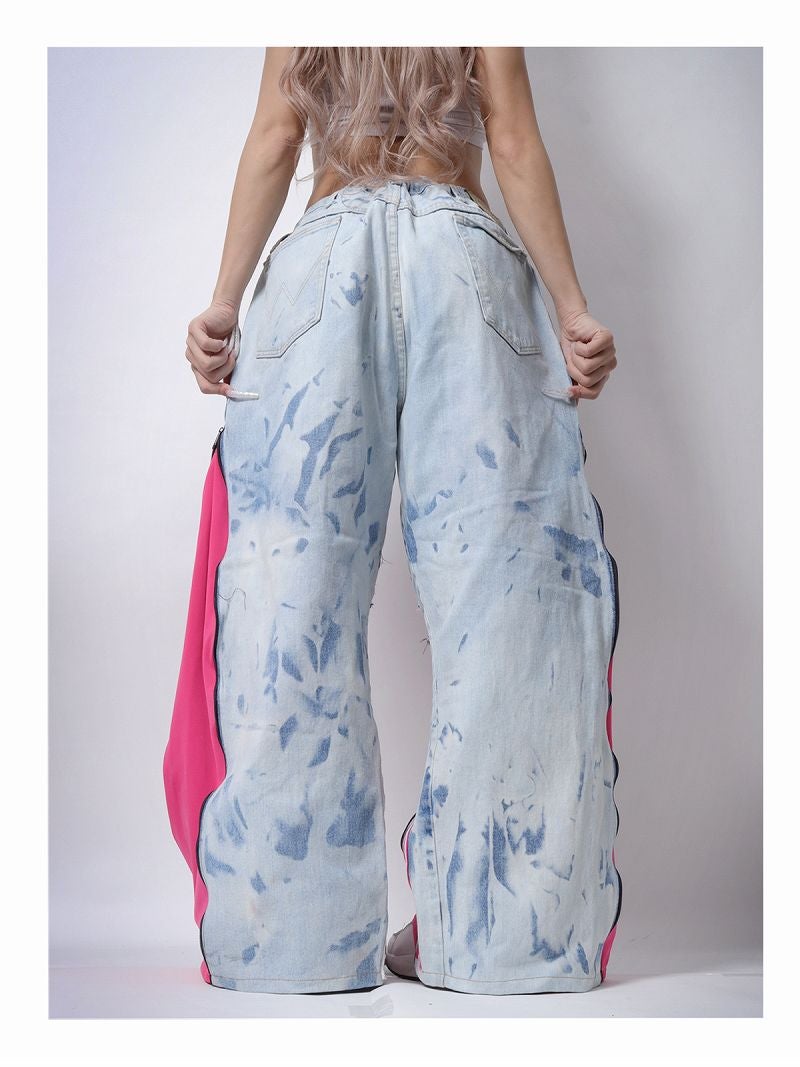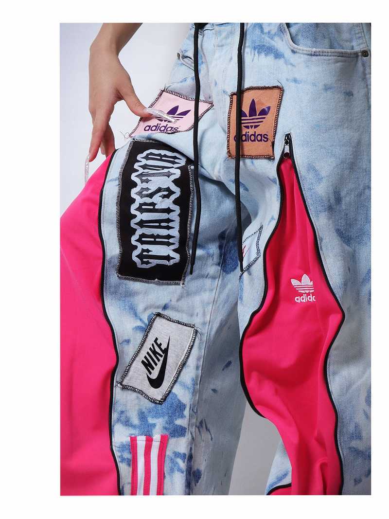 ライトブルーのデニムにビビッドなピンクのジャージ素材をドッキングした、存在感抜群の再構築ワイドパンツ。