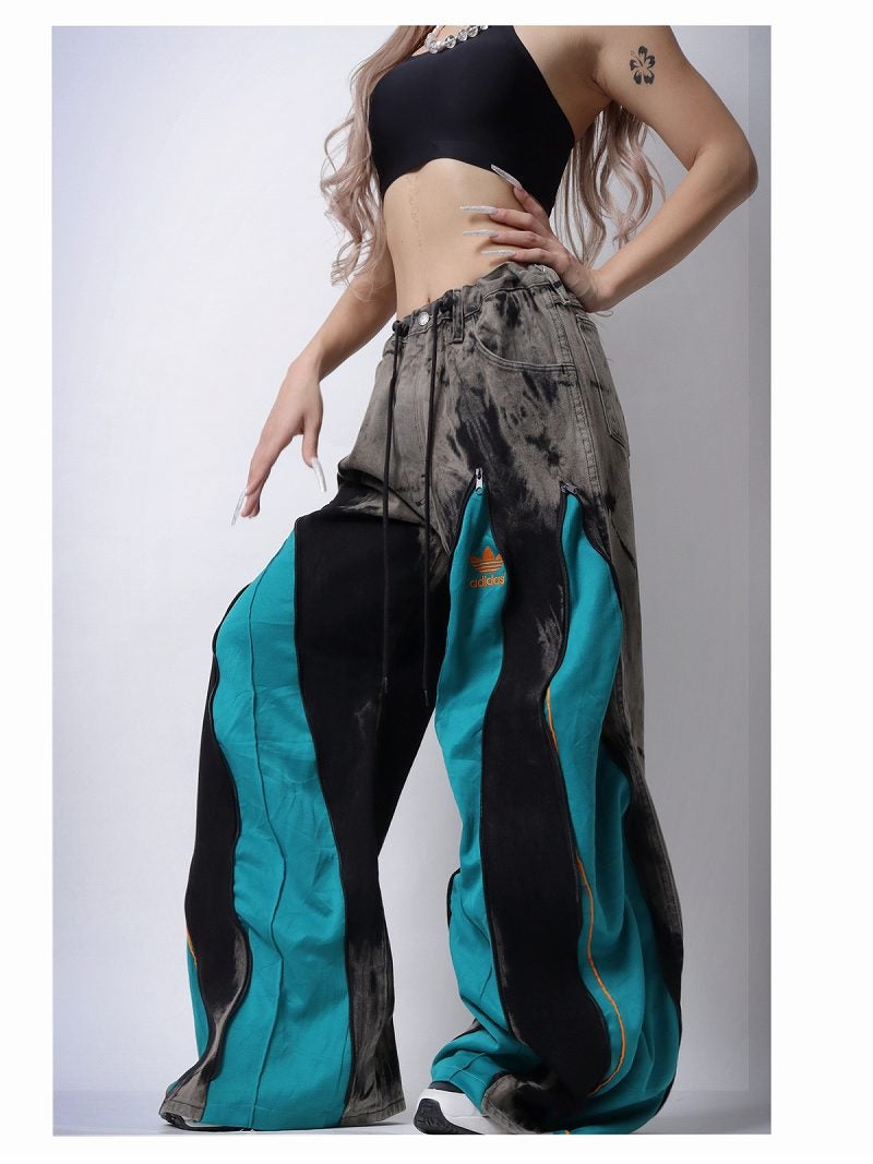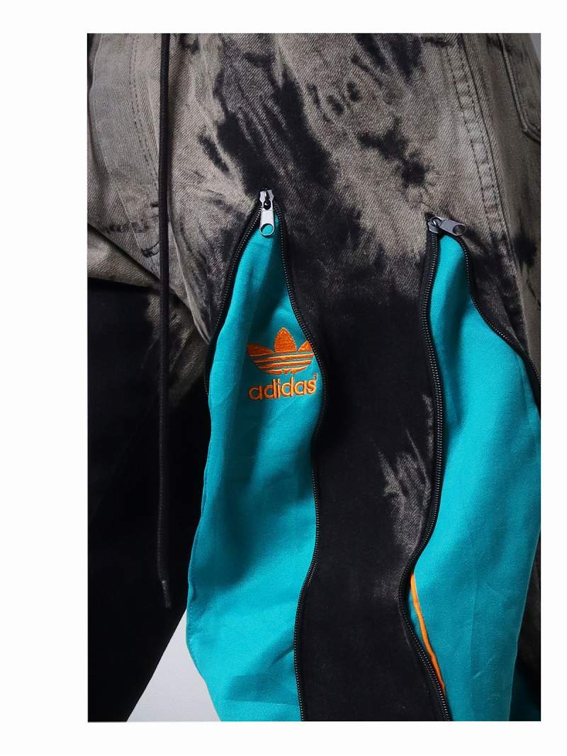 シックなブラックデニムに鮮やかなターコイズグリーンのアディダスジャージを組み合わせたリメイクパンツです。