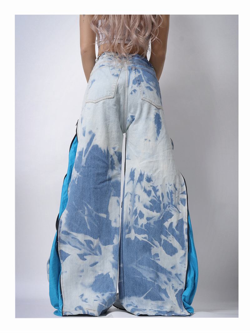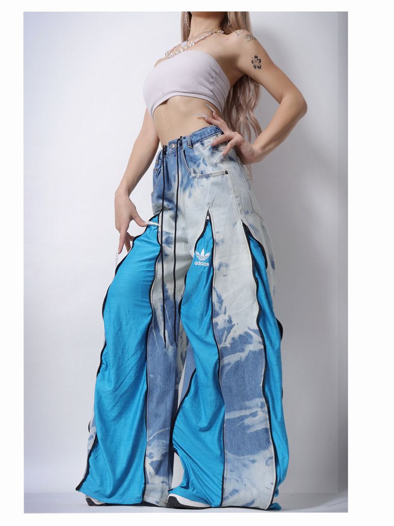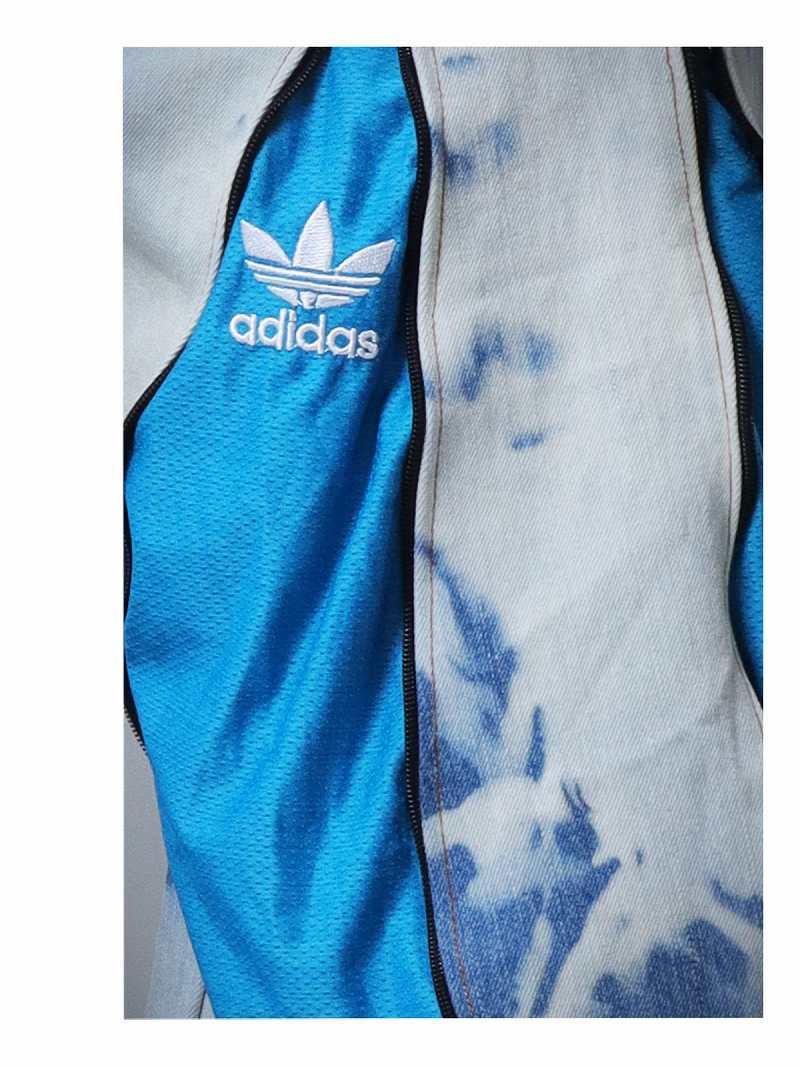 爽やかなタイダイ染めデニムと鮮やかなスカイブルーのadidasジャージを組み合わせたリメイクパンツです!