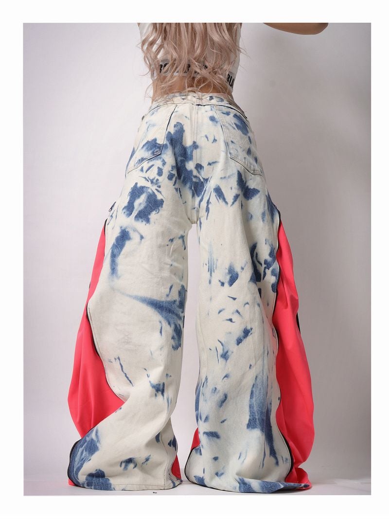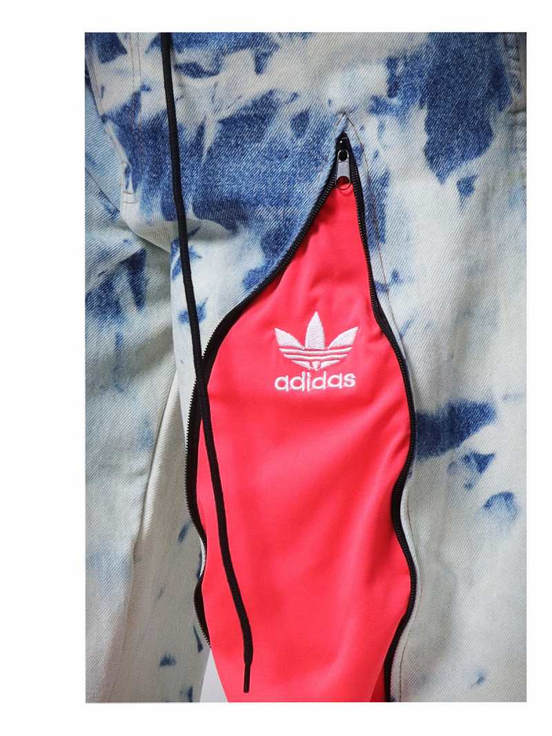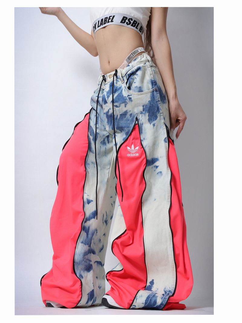 タイダイ染めのデニム生地と鮮やかな蛍光ピンクのadidasジャージを組み合わせた、インパクト抜群のリメイクパンツです。