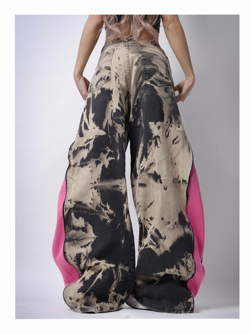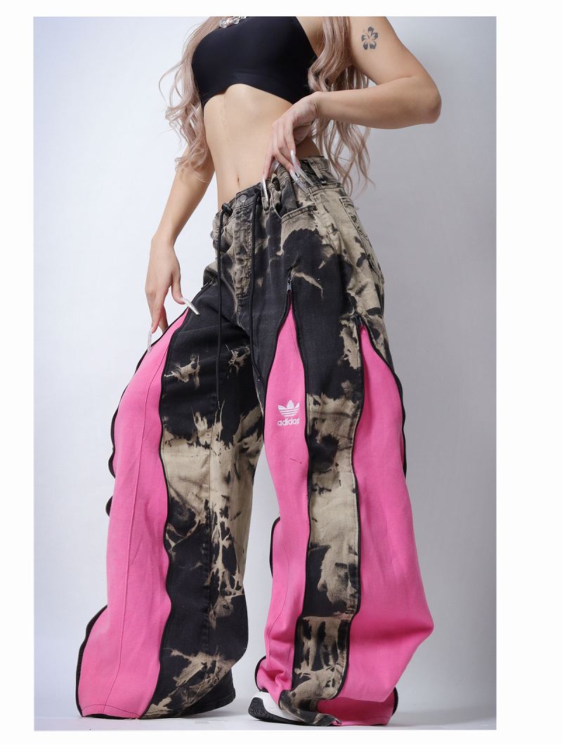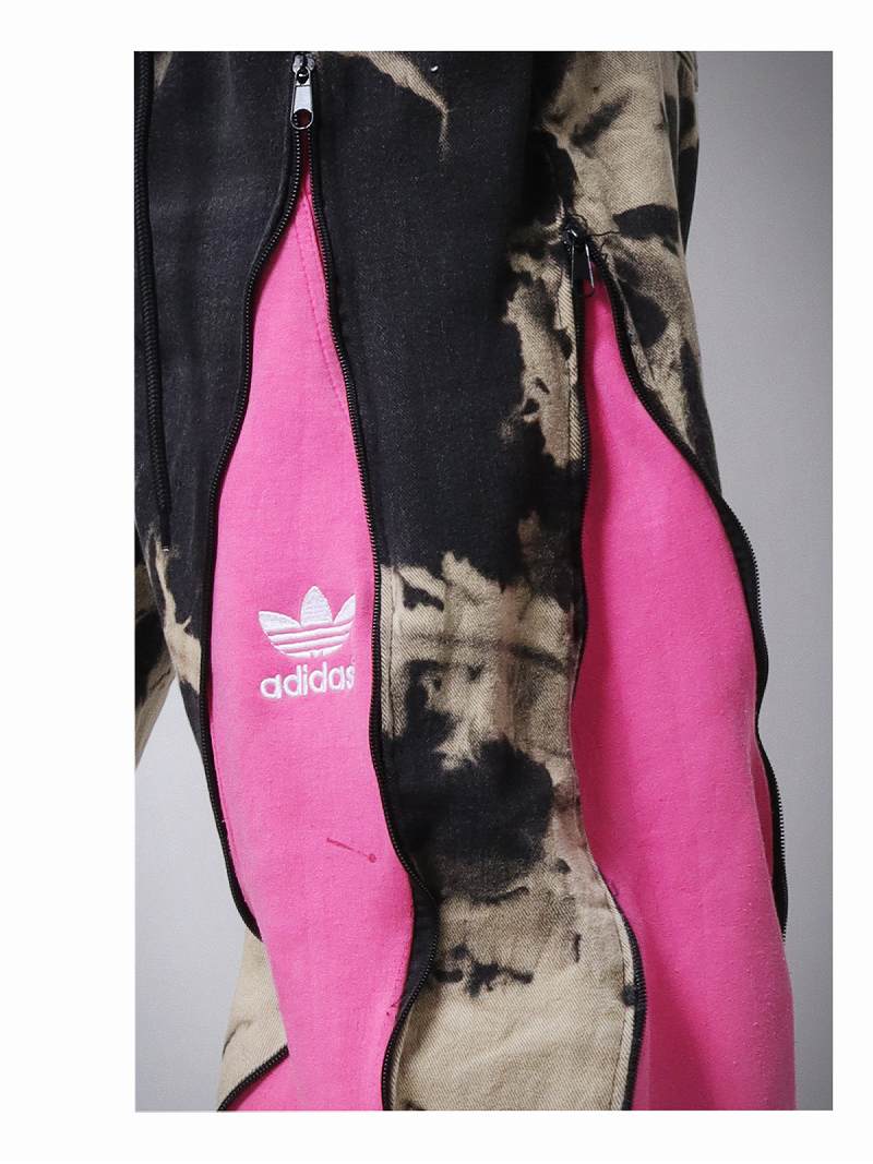 ベージュのタイダイデニムとビビッドなピンクのadidasジャージをドッキングさせた再構築パンツ。