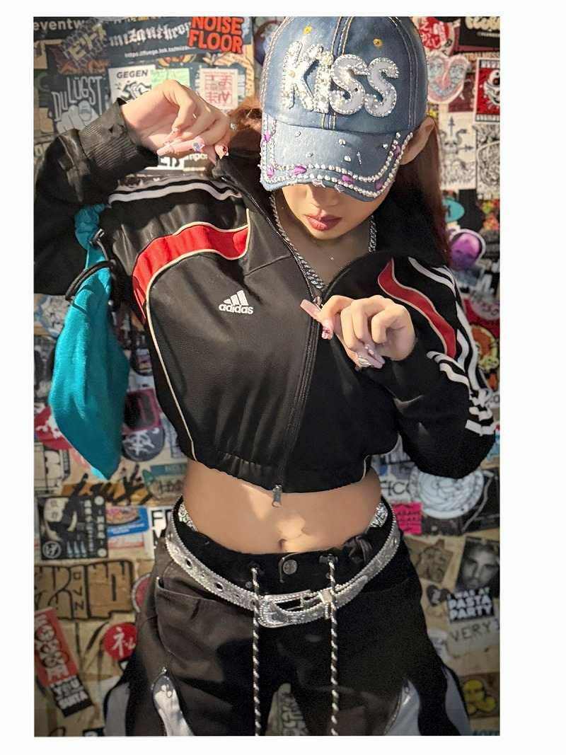 adidasのトラックジャケット(ジャージ)を大胆にリメイクし、トレンドのクロップド丈(ショート丈)に再構築したアウターです。