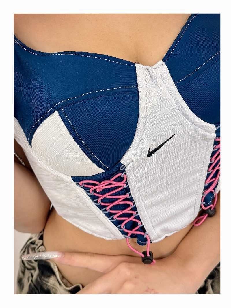 NIKEのジャージ素材を贅沢に使用し、現代的なコルセット風シルエットに再構築したリメイクトップス。