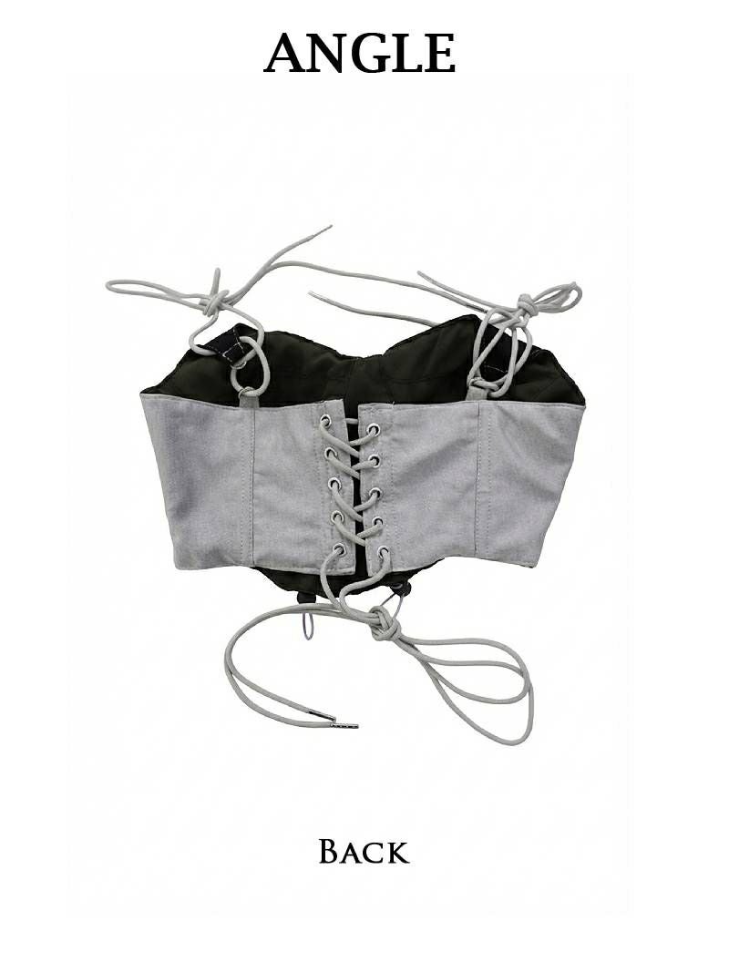 フロントの編み上げデザインとドローコードがアクセントになり、エッジの効いたY2Kスタイルを演出します。
