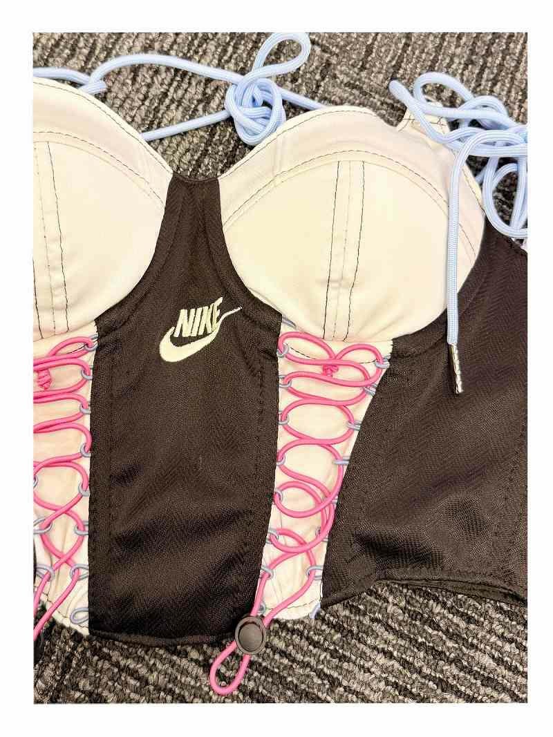 ナイキのジャージ素材を大胆にリメイクした、ストリート感溢れる再構築コルセットビスチェ。