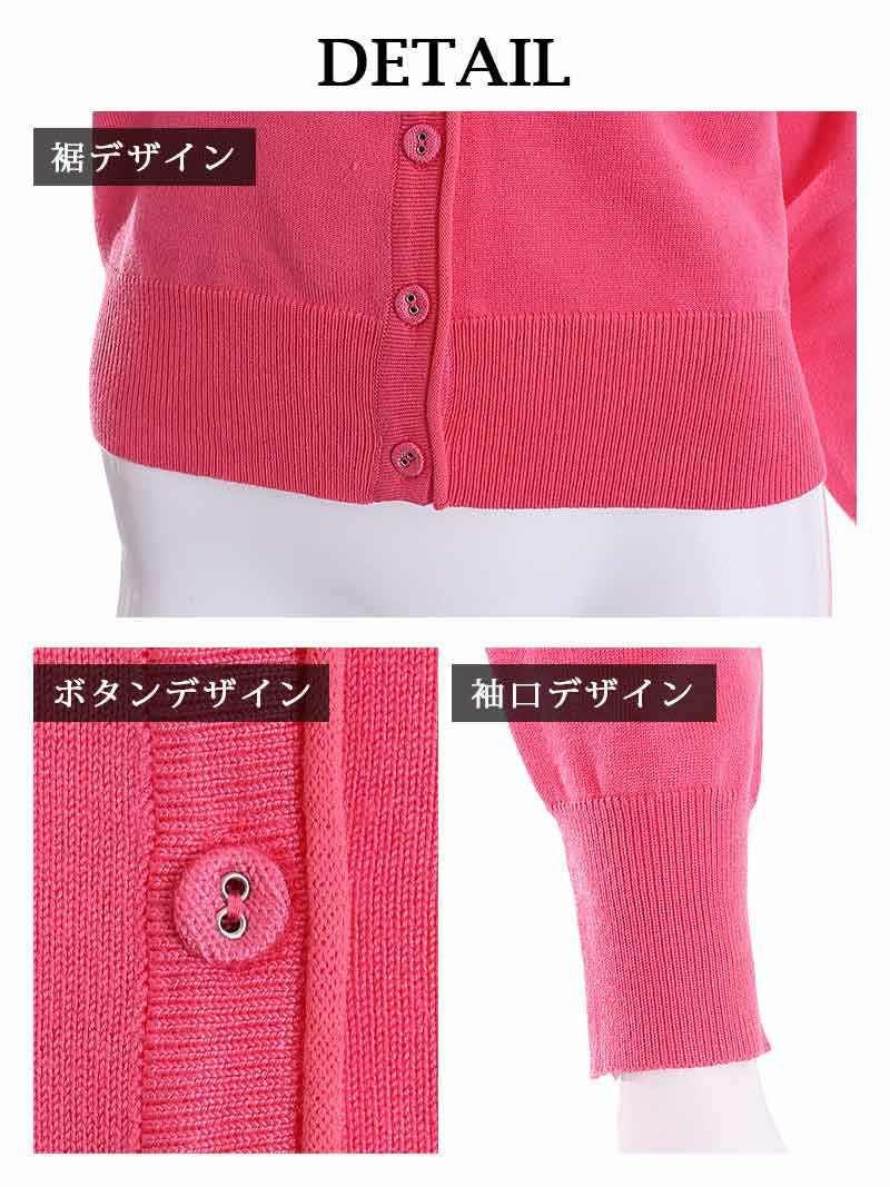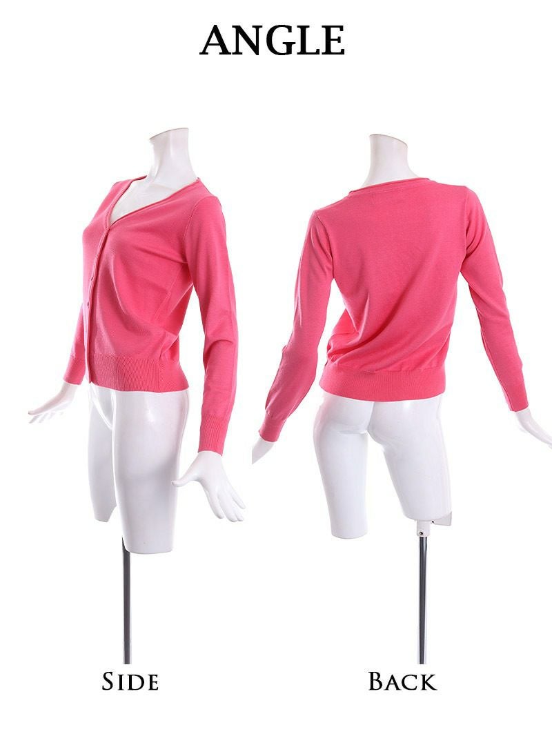 鮮やかなピンク色のカーディガンはジャストサイズで、ピッタリ着れるから細見え効果◎