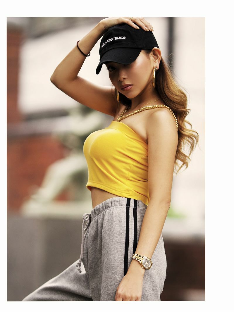 ベアトップでへそ出しコーデ!ストリート映え確定。カップ付きだから1枚でOK!レッスンも楽ちん!シンプルだから着回し無限!ダンサーのマストアイテム。黒白はもちろん、ピンクやイエローで差をつけよ!B系ファッションにハマるクロップドチューブトップ!