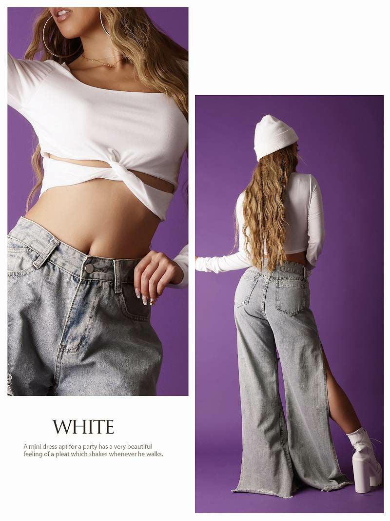 鎖骨チラ見せが魅力の無地ショート丈トップス!変形デザインでシルエット美しく、動きもラクラク。ハイウエストボトムと相性抜群の長袖カットソー! デートや夜遊びにもハマるセクシーなクロップドトップス♪ストリート感満載でダンサーも使いやすい万能アイテム。