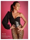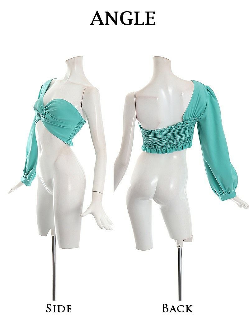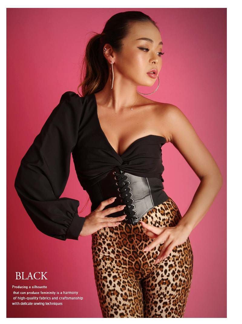 長袖のワンショルダーが大胆な肩とお腹見せのインポート風トップス。