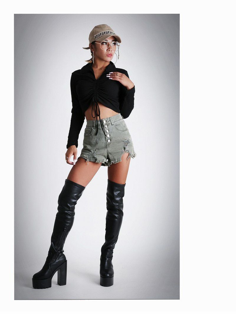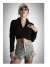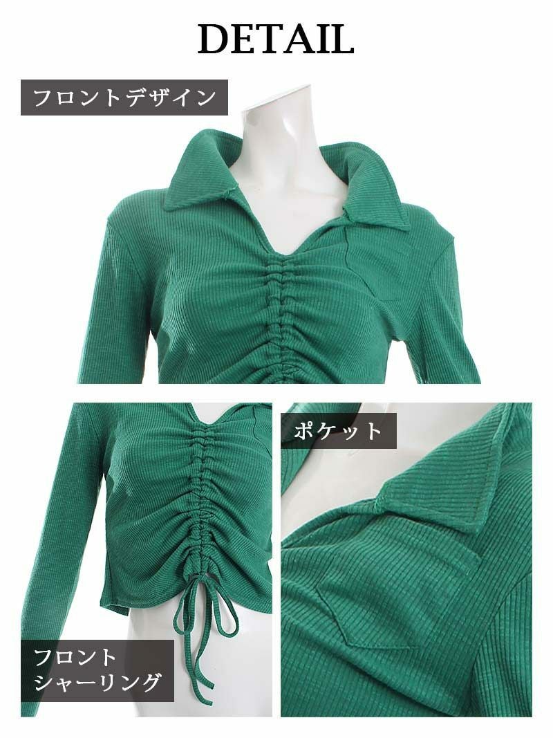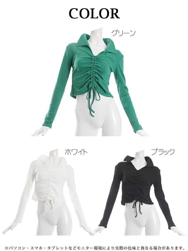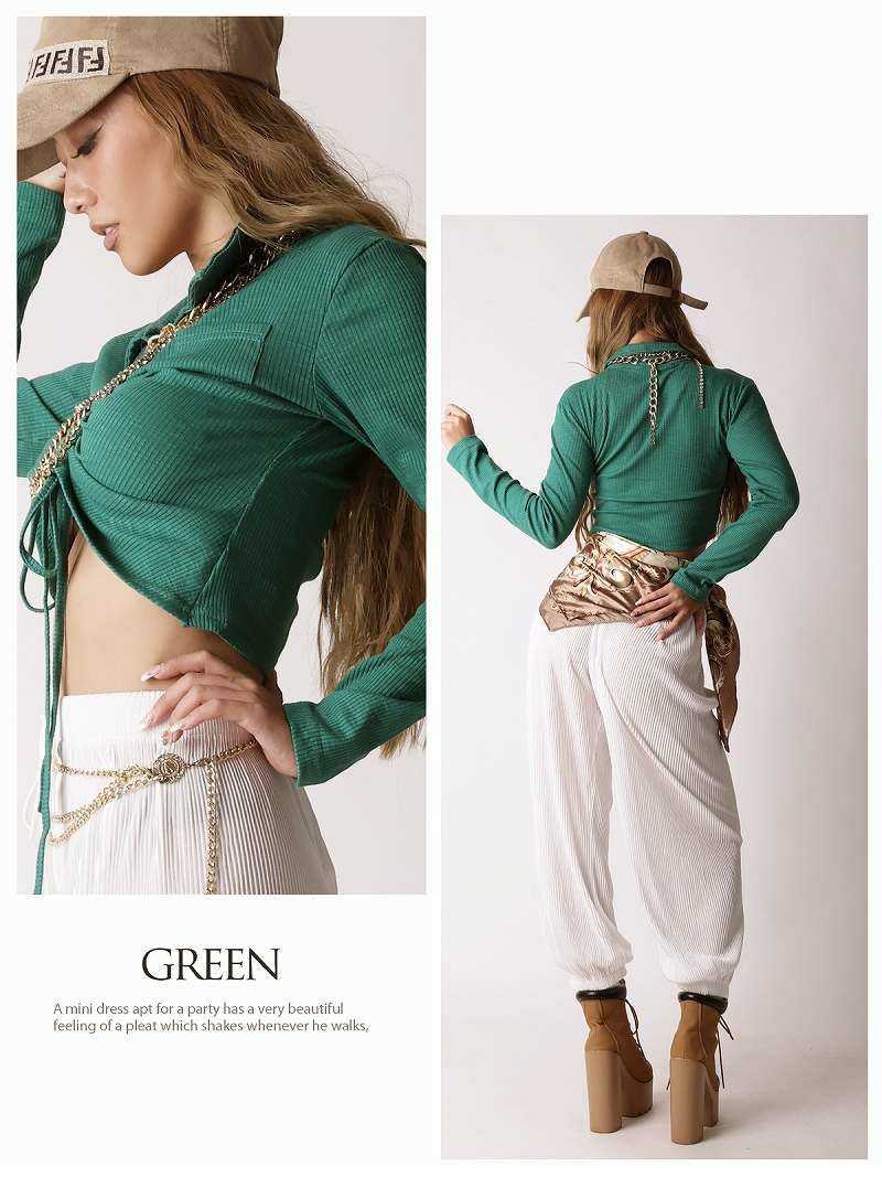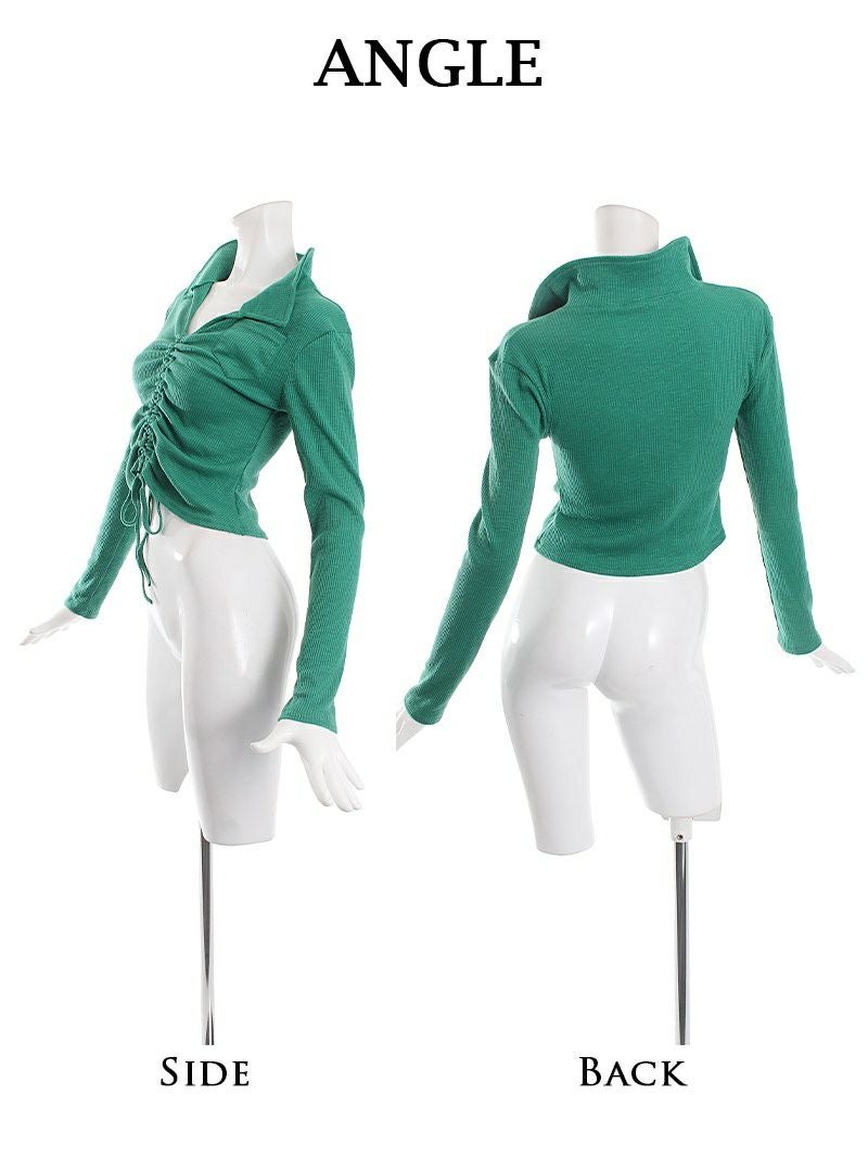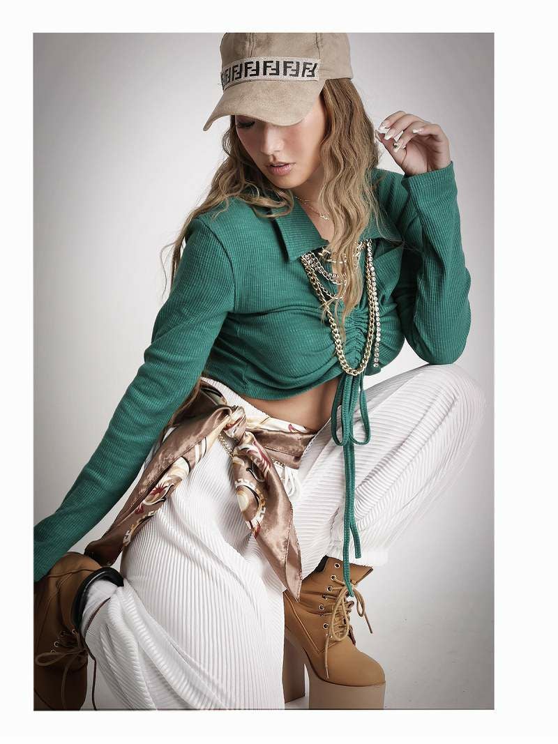 フロントシャーリングで着丈が調節出来る長袖トップスはダンサーのプライベートファッションにオススメ。
