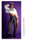 ストリートなロゴプリントトレーナーはメンズライクなコーデに◎ダボダボ袖がかっこいいのにお腹見せでセクシーさもアピールできるカジュアルトップス。