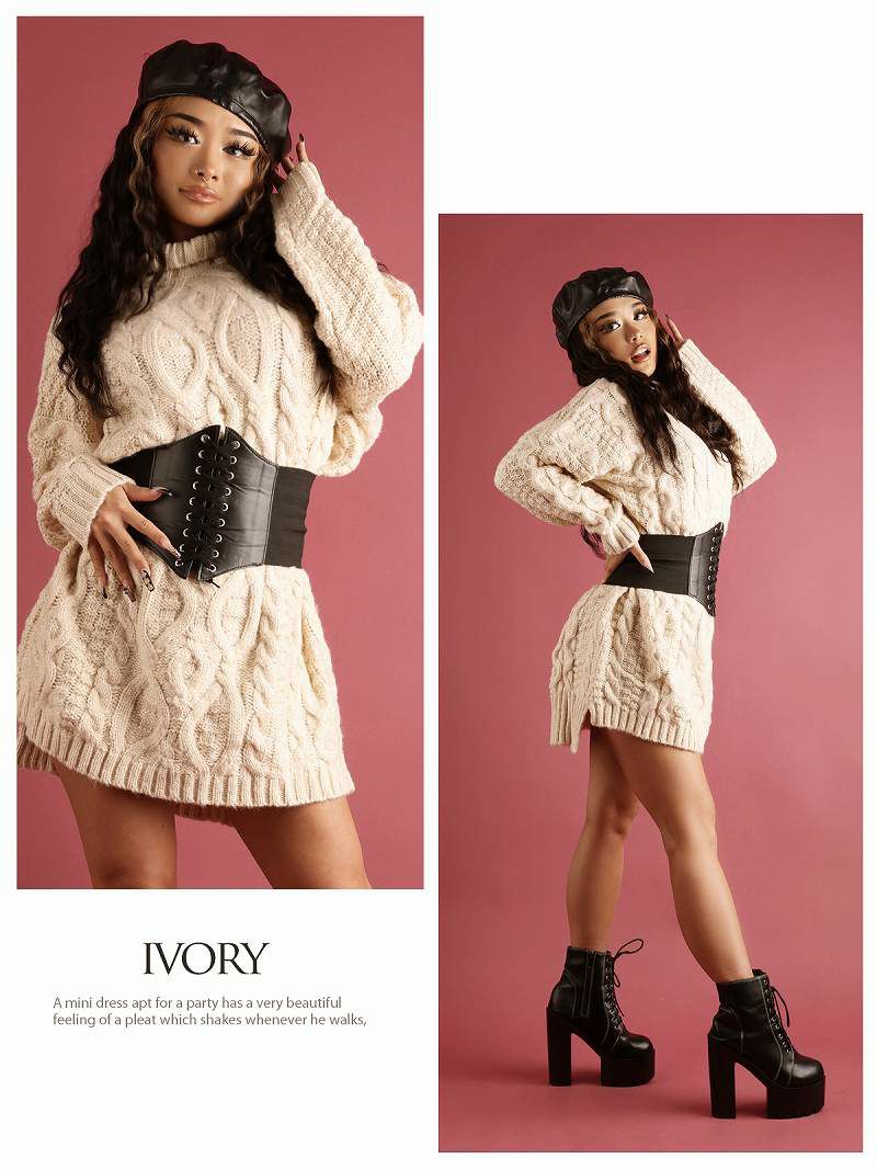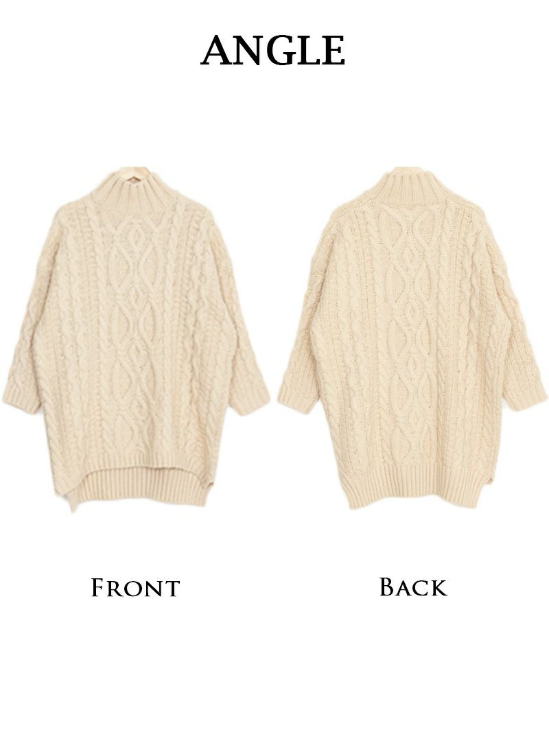 ざっくりニットワンピがゆるっと可愛い♪ ケーブルニットワンピースハイネックトップス ストリート系【B/bomb】(M)(ピンク/イエロー/アイボリー)