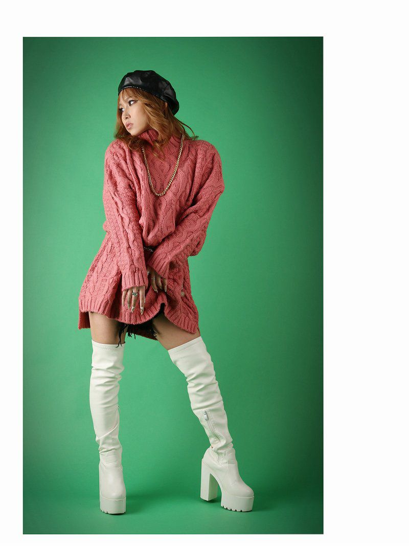 4. ケーブルニットワンピースハイネックトップス ストリート系【B/bomb】(M)(ピンク/イエロー/アイボリー)