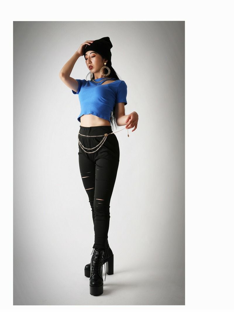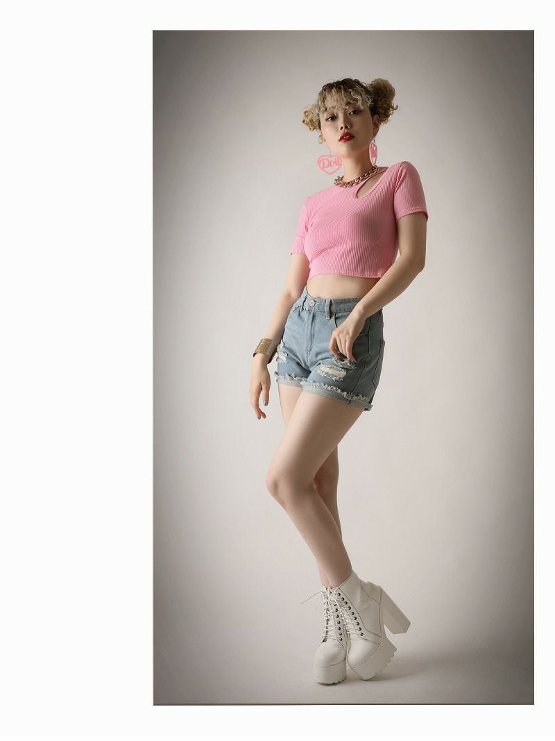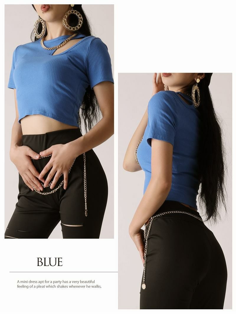 インポートならではの個性的なショルダーのカットアウトデザインが周りの視線を独り占め!今っぽくセクシーにキマるミニ丈Tシャツ!