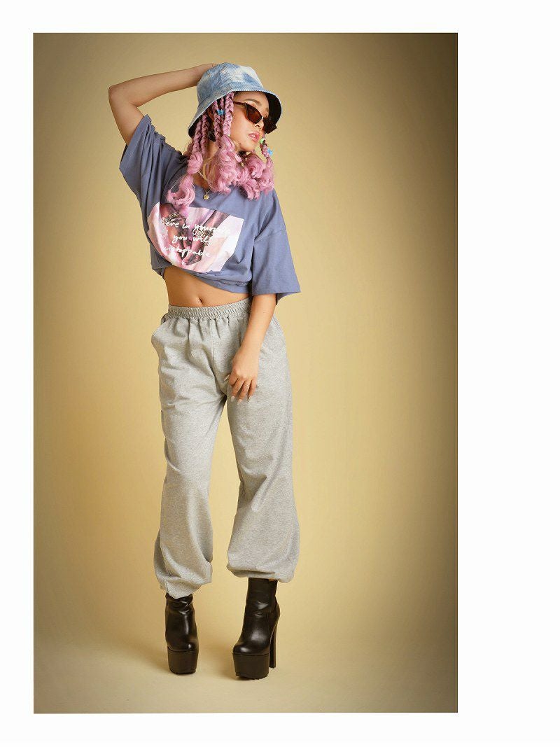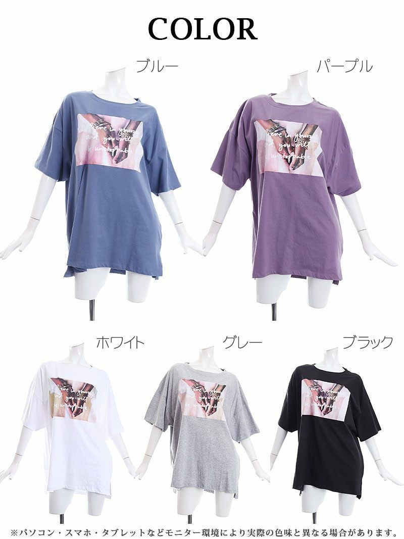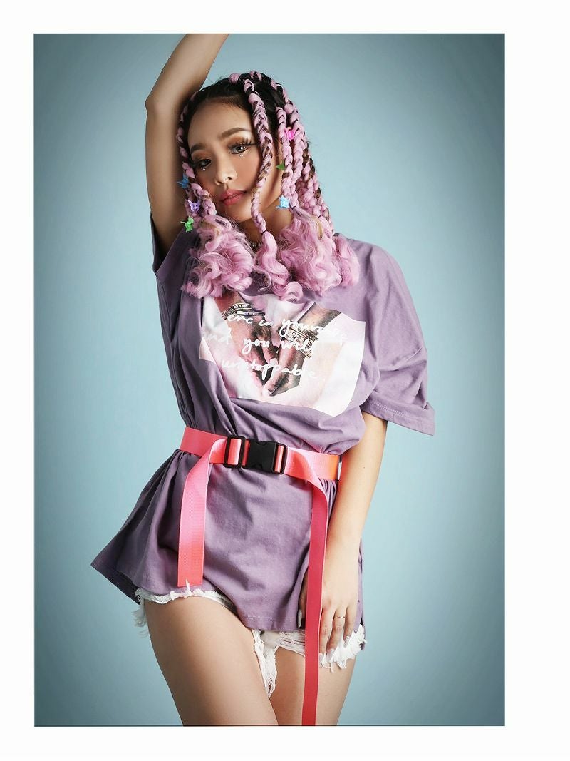大きめシルエットのプリントTシャツはベルトやショートパンツと合わせてワンピース風の着こなしやスウェットパンツと合わせてもダボっとオシャレにキマる!