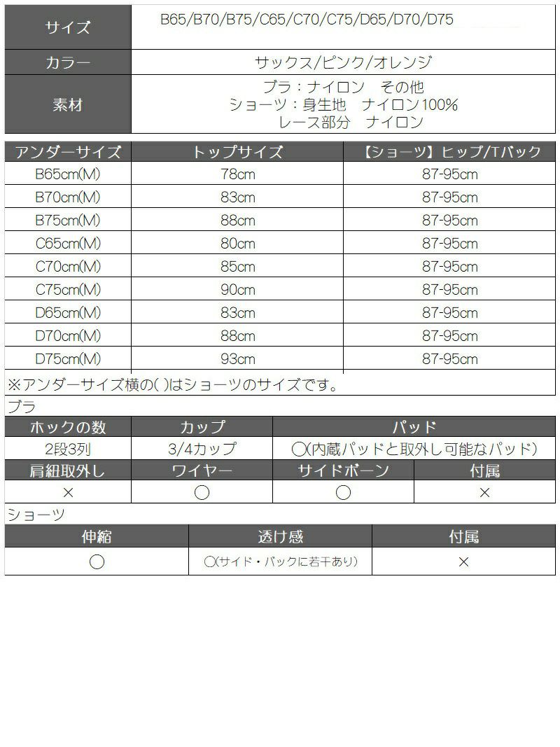 他の画像を見る グラデーションランジェリー 3点セット!花柄レースグラデーションブラ&ショーツセット ストリート系【B/bomb】(サックス/ピンク/オレンジ) 希望小売価格 ¥ 3,975 のところ ¥ 3,058 税込 会員価格あり 詳細を見る お気に入りに登録する