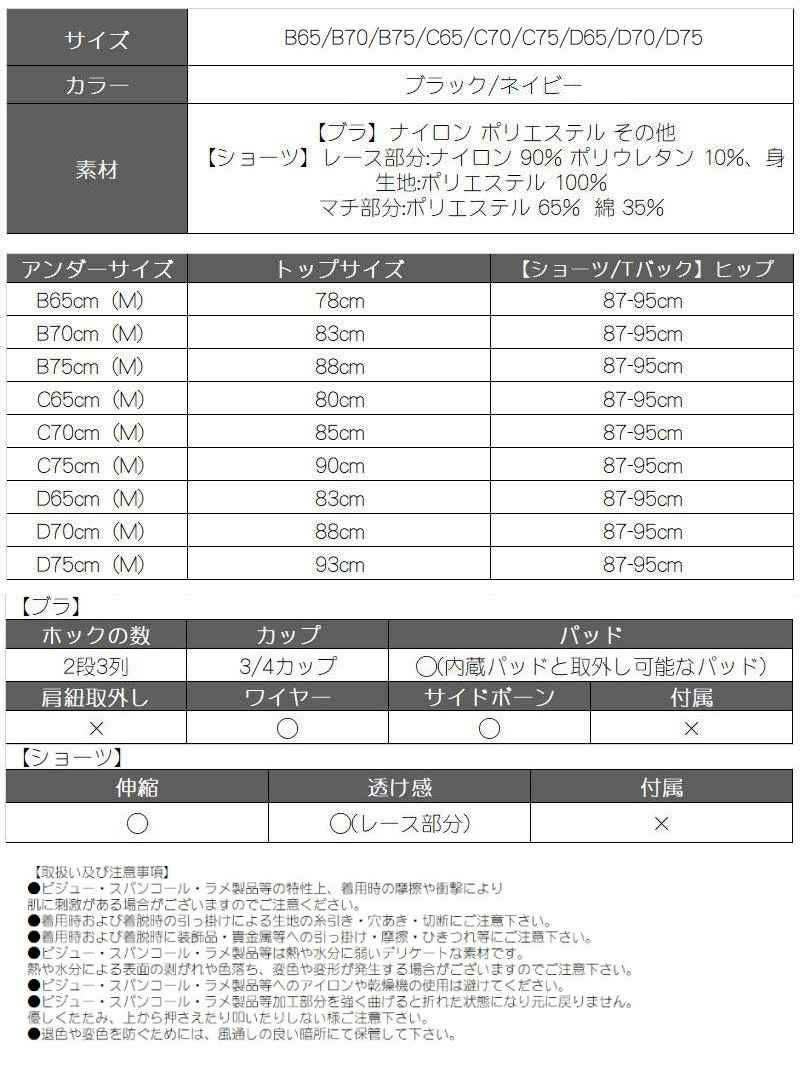 【ショーツ】レース部分:ナイロン 90% ポリウレタン 10%、身生地:ポリエステル 100% マチ部分:ポリエステル 65% 綿 35%