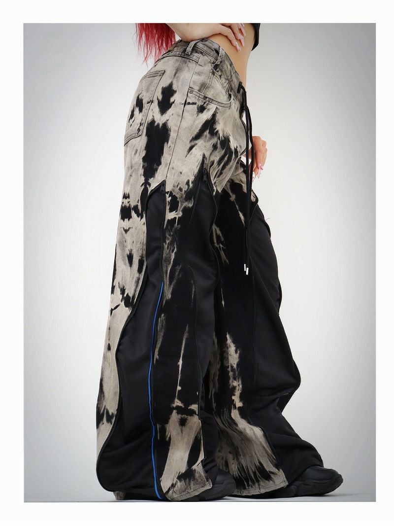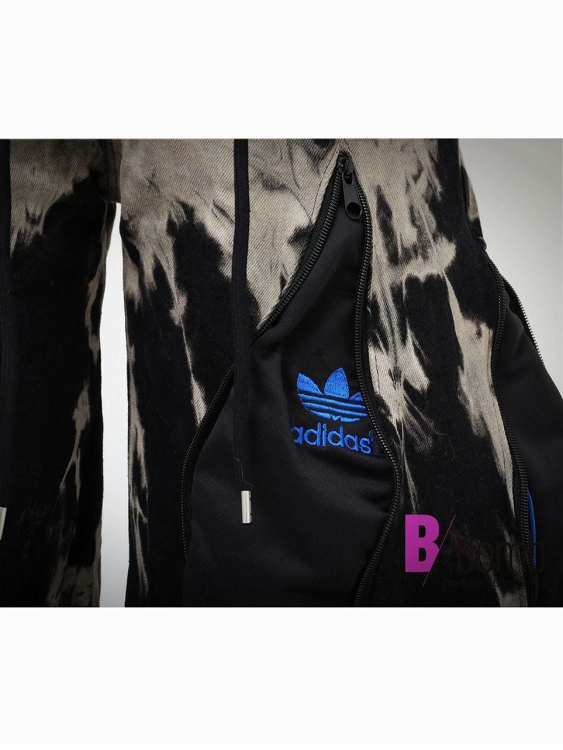 クラッシュデニムに青色のアディダスロゴを大胆に組み合わせた、存在感抜群のリメイクデニム。