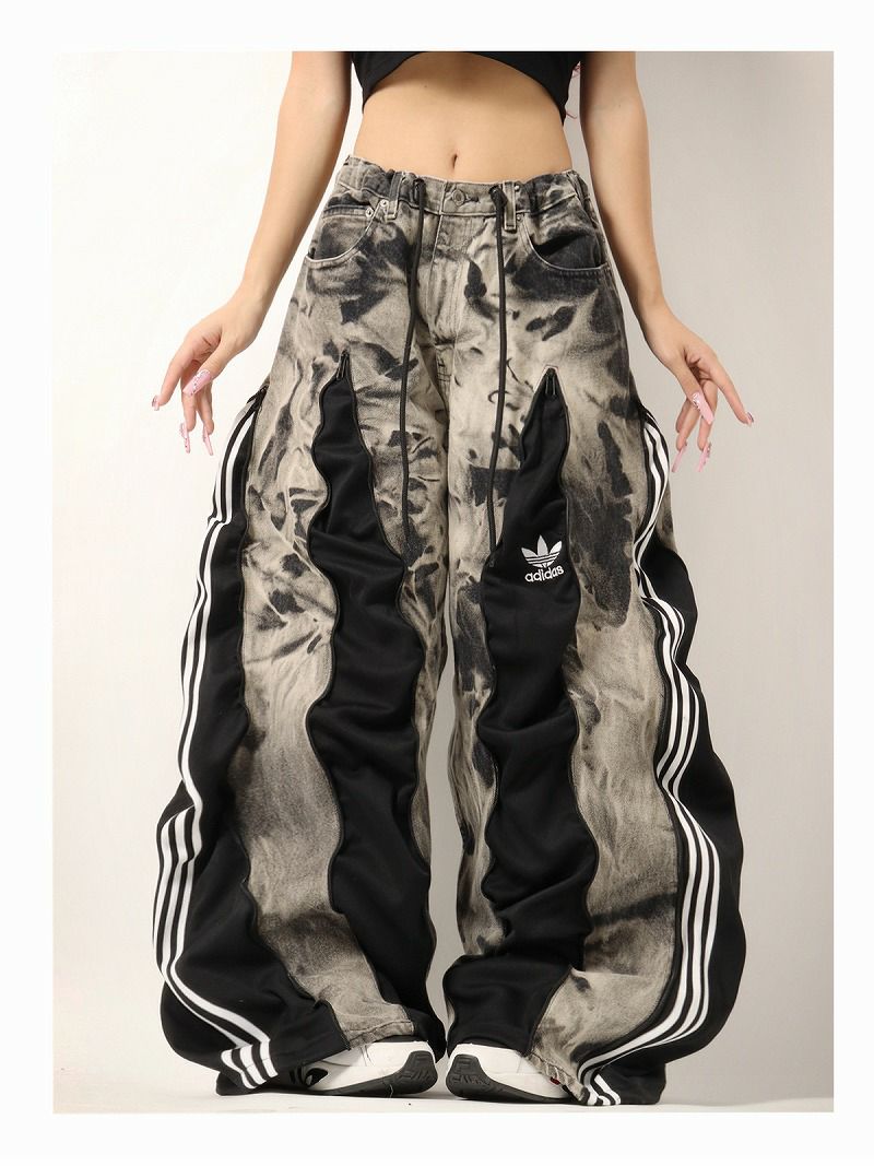 黒とグレーのタイダイ(ブリーチ)加工が施されたデニムと、ブラックのadidasジャージ素材をダイナミックに組み合わせた、個性あふれる再構築リメイクパンツ。