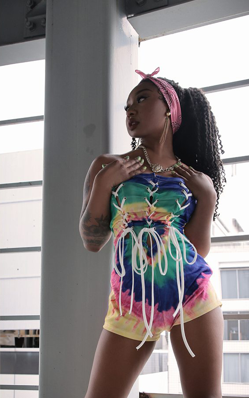 タイダイ柄のド派手なレインボーカラーが周りの視線を釘付けにする目立ち度MAXなダンスコスチューム。