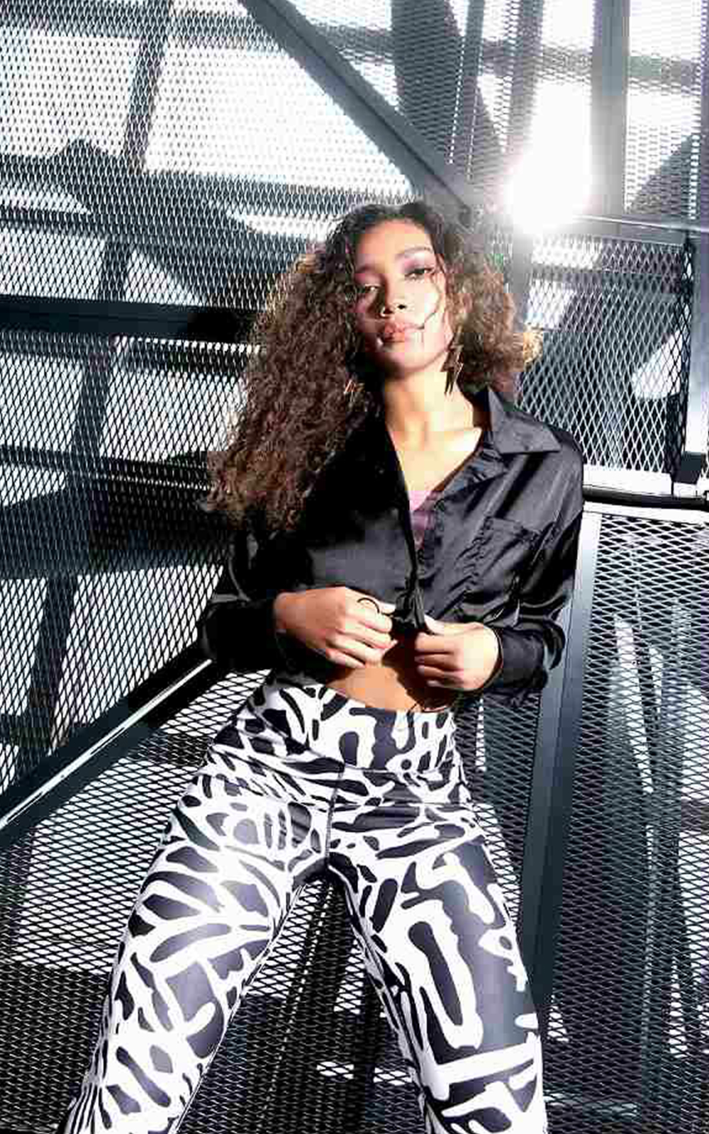 COOLなブラックトップスとゼブラ柄パンツにPINKスニーカーとインナーでガーリーさをプラス。