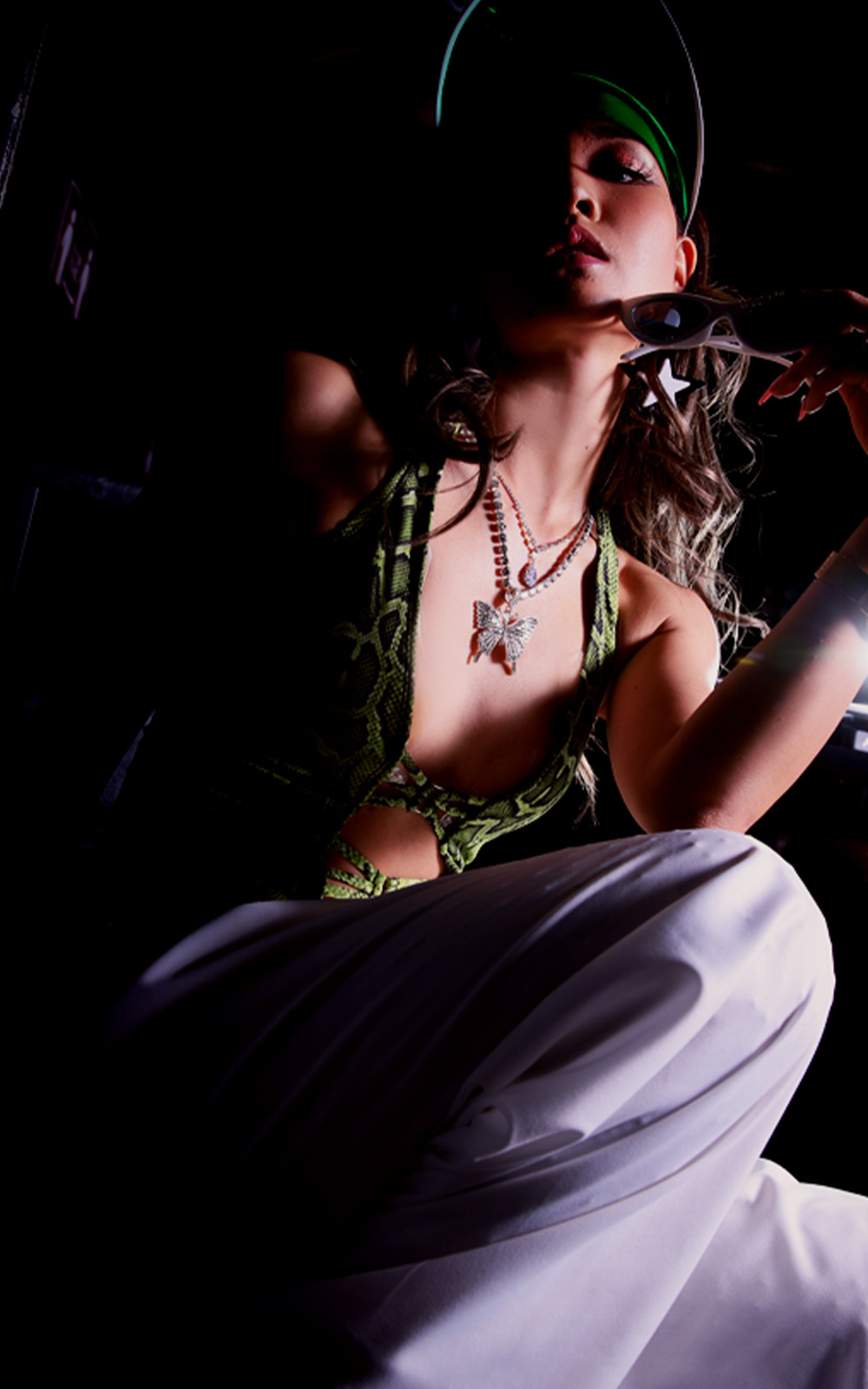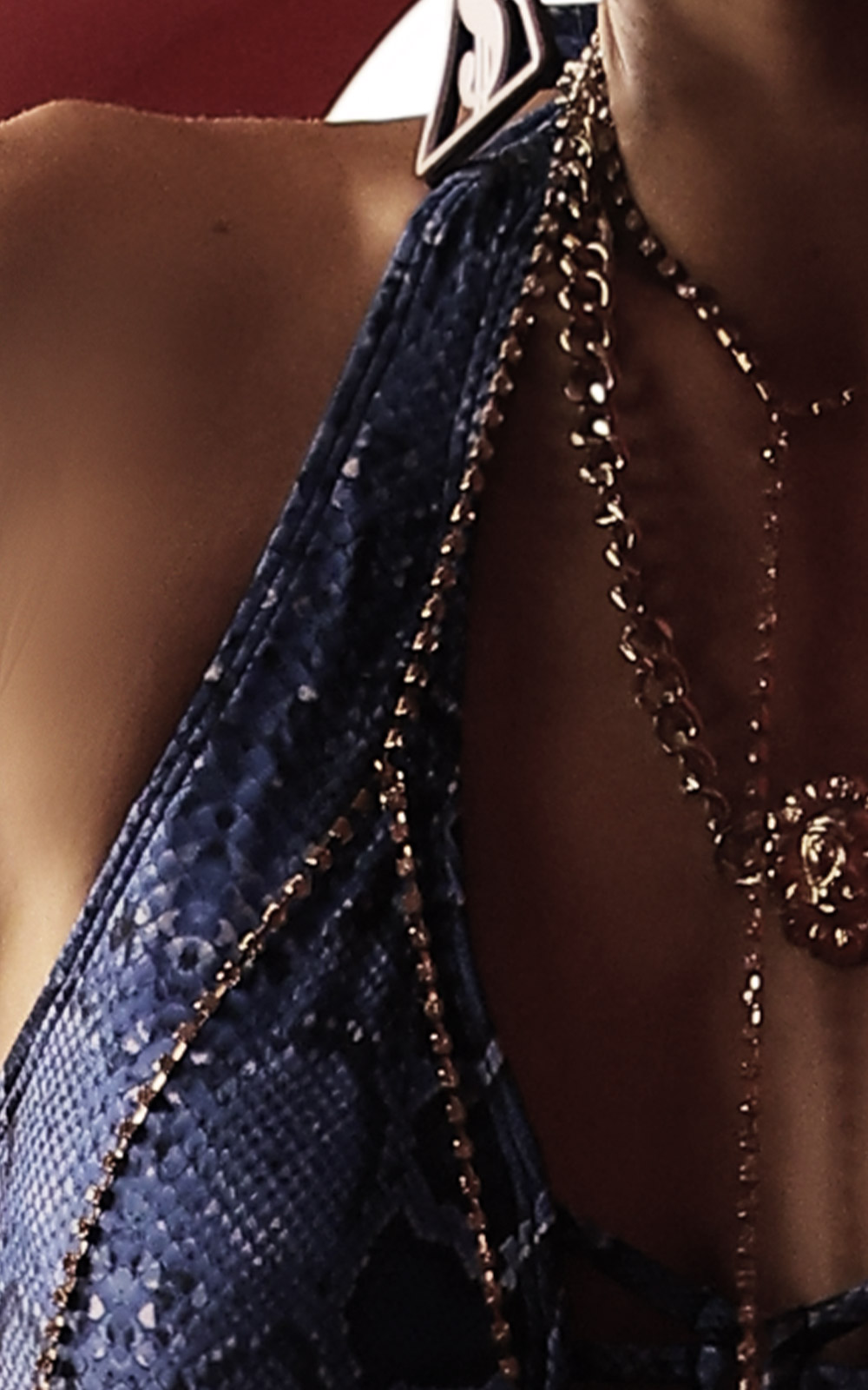 シルバーの大きめアクセとボディーチェーンであえて色を絞りこんだコスチュームで.